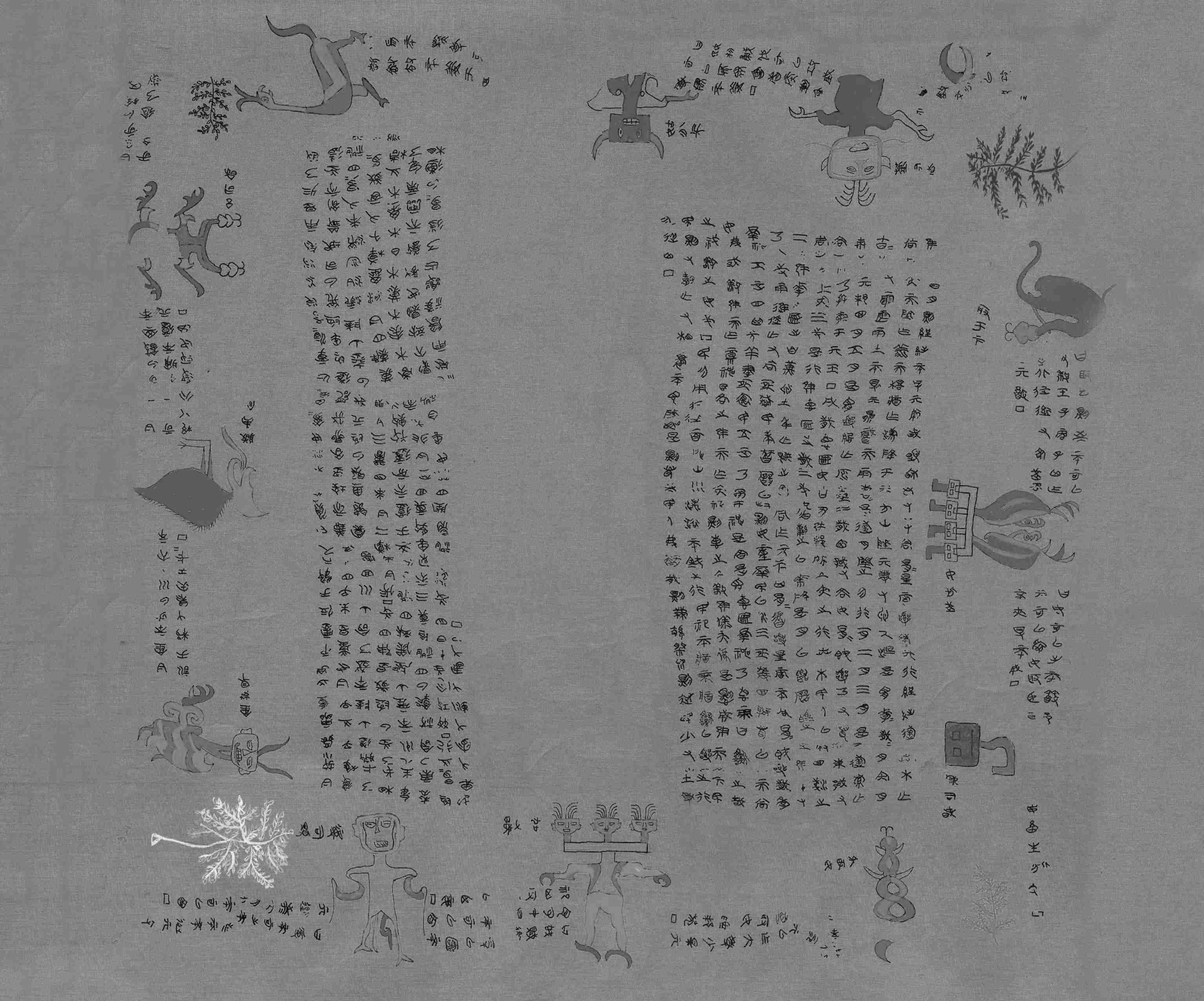 帛书四角画有彩色树木。东北、东南、西南、西北四角树木分别为绿、红、白、黑四色,代表春、夏、秋、冬四季。