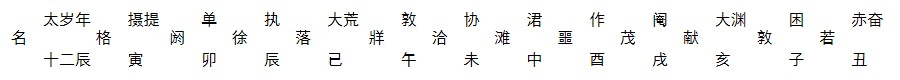 上文说过,十二个太岁年名和十二辰对应。为便于查阅,再作简表如下: