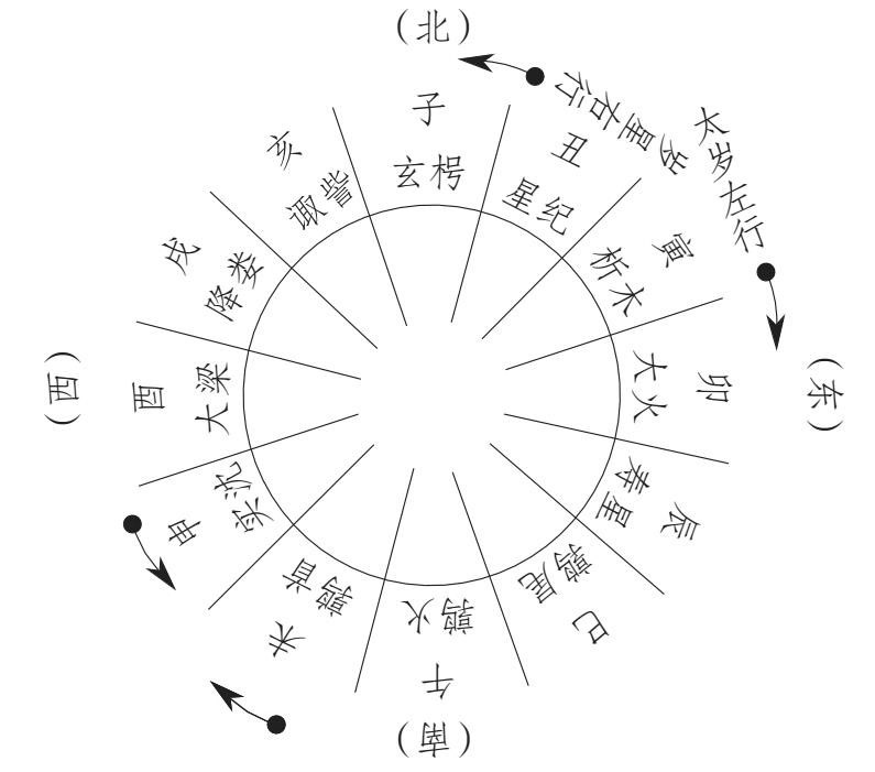 岁星由西向东进行,和人们所熟悉的十二辰的方向和顺序正好相反,所以岁星纪年法在实际生活中应用起来并不方便。为此,古代天文占星家便设想出一个假岁星叫做太岁 (《汉书·天文志》叫做太岁,《史记·天官书》叫做岁阴,《淮南子·天文训》叫做太阴) ,让它和真岁星“背道而驰”,这样就和十二辰的方向顺序相一致,并用它来纪年。根据《汉书·天文志》所载战国时代的天象纪录,某年岁星在星纪,太岁便在析木 (寅) ,这一年就是“太岁在寅”;第二年岁星运行到玄枵,太岁便运行到大火 (卯) ,这一年就是“太岁在卯”,其余由此类推,如下页图2-7所示。