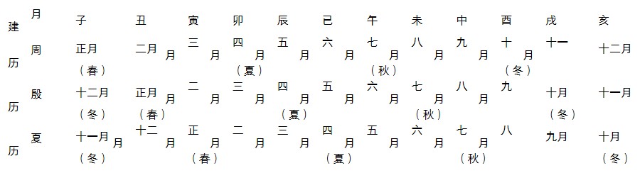 春秋战国时代有所谓夏历、殷历和周历,三者主要的区别在于岁首的月建不同,所以又叫作三正。周历以通常冬至所在的建子之月 (即夏历的十一月) 为岁首,殷历以建丑之月 (即夏历的十二月) 为岁首,夏历以建寅之月 (即后世通常所说的阴历正月) 为岁首。周历比殷历早一个月,比夏历早两个月。由于三正岁首的月建不同,四季也就随之而异。下表以月建为纲,说明三正之间月份和季节的对应:
