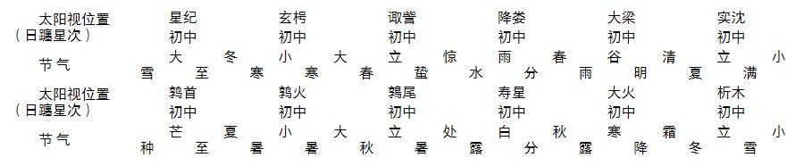 二十四节气是根据太阳在黄道上不同的视位置定的。前面讲天文时说过,古人把黄道附近一周天平分为星纪、玄枵(xiāo)等十二次,太阳运行到某次就交某某节气 (实际上二十四个节气是表示地球在围绕太阳公转的轨道上的二十四个不同的位置) 。试以《汉书·律历志》所载的二千多年前的天象为例。太阳运行到星纪初点交大雪,运行到星纪中央交冬至,运行到玄枵初点交小寒,运行到玄枵中央交大寒,等等。下表就说明了这种情况: