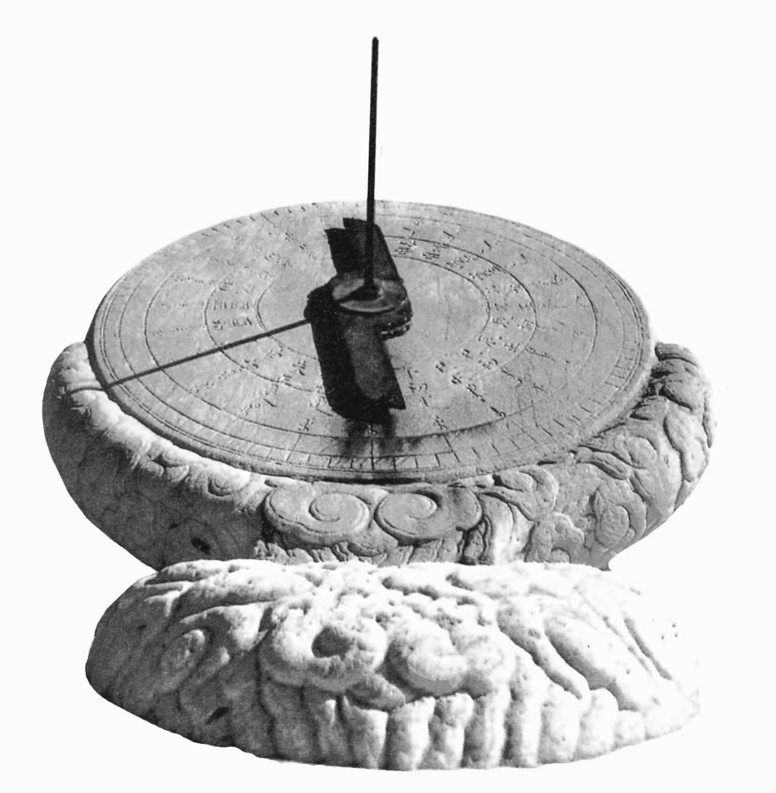 日晷盘上有十二个时辰的刻度,中竖铜针。