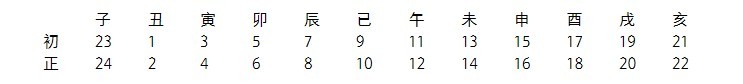古人对于一昼夜有等分的时辰概念之后,用十二地支表示十二个时辰,每个时辰恰好等于现代的两小时。 (小时本来是小时辰的意思;因为一小时只等于半个时辰。) 和现代的时间对照,夜半十二点 (即二十四点) 是子时 (所以说子夜) ,上午两点是丑时,四点是寅时,六点是卯时,其余由此顺推。近代又把每个时辰细分为初、正。晚上十一点 (即二十三点) 为子初,夜半十二点为子正;上午一点为丑初,上午两点为丑正,等等。这就等于把一昼夜分为二十四小时了。列表对照如下: