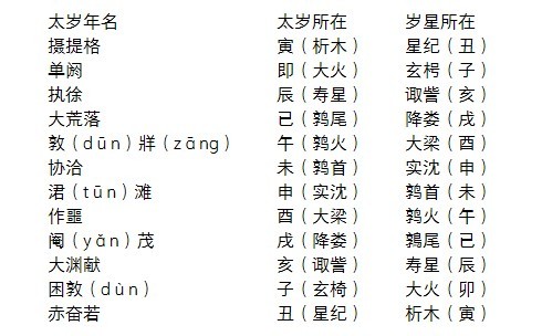 下面列表说明摄提格、单阏等十二个太岁年名和太岁所在、岁星所在的对应关系: