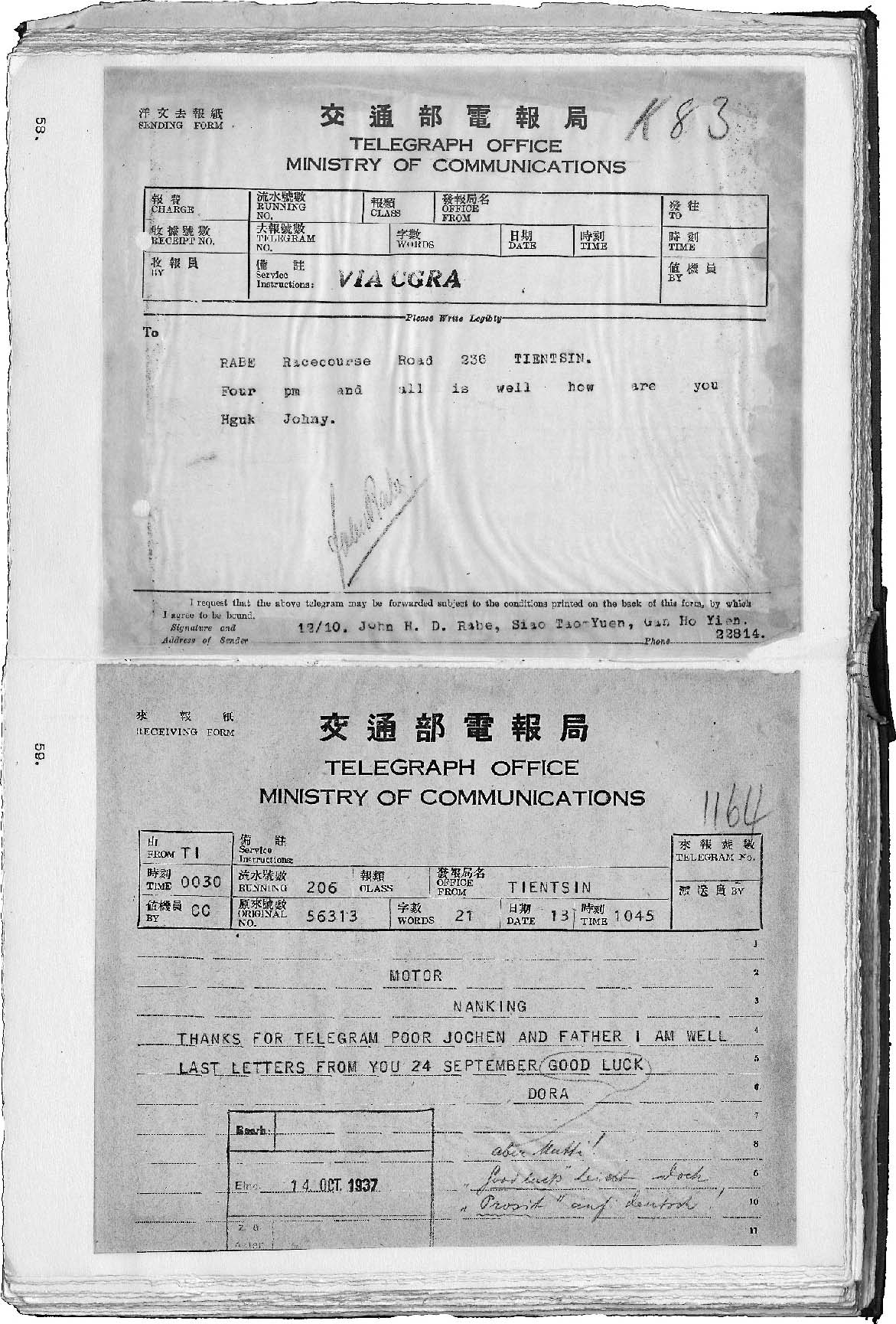 拉贝与夫人多拉的电报往来。