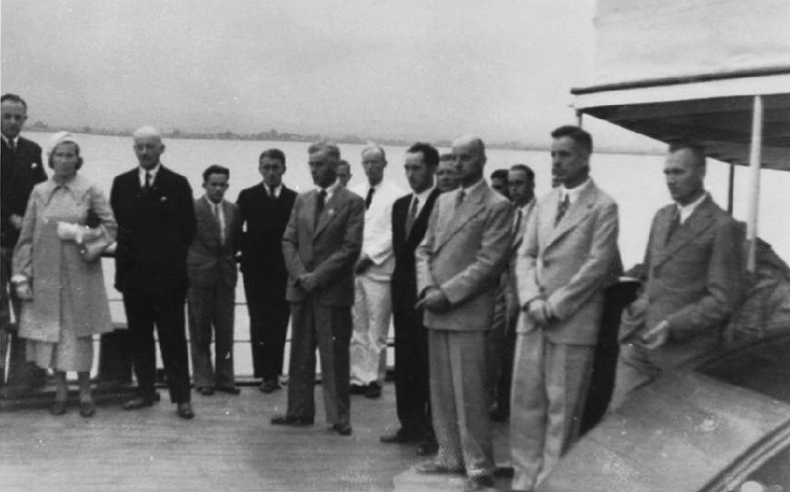 我们第一批客人分散在各个甲板上聊天。14时15分,出现一艘带有卐字旗的流线型摩托艇,腹部有“拉尔克”船名。难道是用英国旗舰的海军上将艇送德国大使上船来?错了!原来它只是一艘装饰得有节日气氛的许尔特尔&霍特船运公司的电报艇,是船主委托几个胆大的朋友这么干的。让我们揭开它的面纱吧:它(拉尔克)的航速的确只是每小时一节多一点,因此与“扬子江客车”的外号是不相称的。15时,大使先生带着其他成员来了。人们高高兴兴地欢迎大使先生,并陪同他再次参观了全船,客人们被邀请和英国船长及其军官们一同共进下午5点钟茶点。人们愉快地接受了邀请。大家聚在餐厅里吃点心,花了一个多小时。前甲板布置了卐字旗和装饰花束(我们本来准备送给女士们的)的临时讲台,眨眼间变成了节日的会场。我们在庄严的气氛中走了出来,一小群忠诚的人围聚在他们的党首国社党党员平克内勒的周围。他代表缺席的地区小组长致欢迎词,并感谢德国大使的努力和关心,使我们能在这个安全的避难所庆祝收获感恩节。