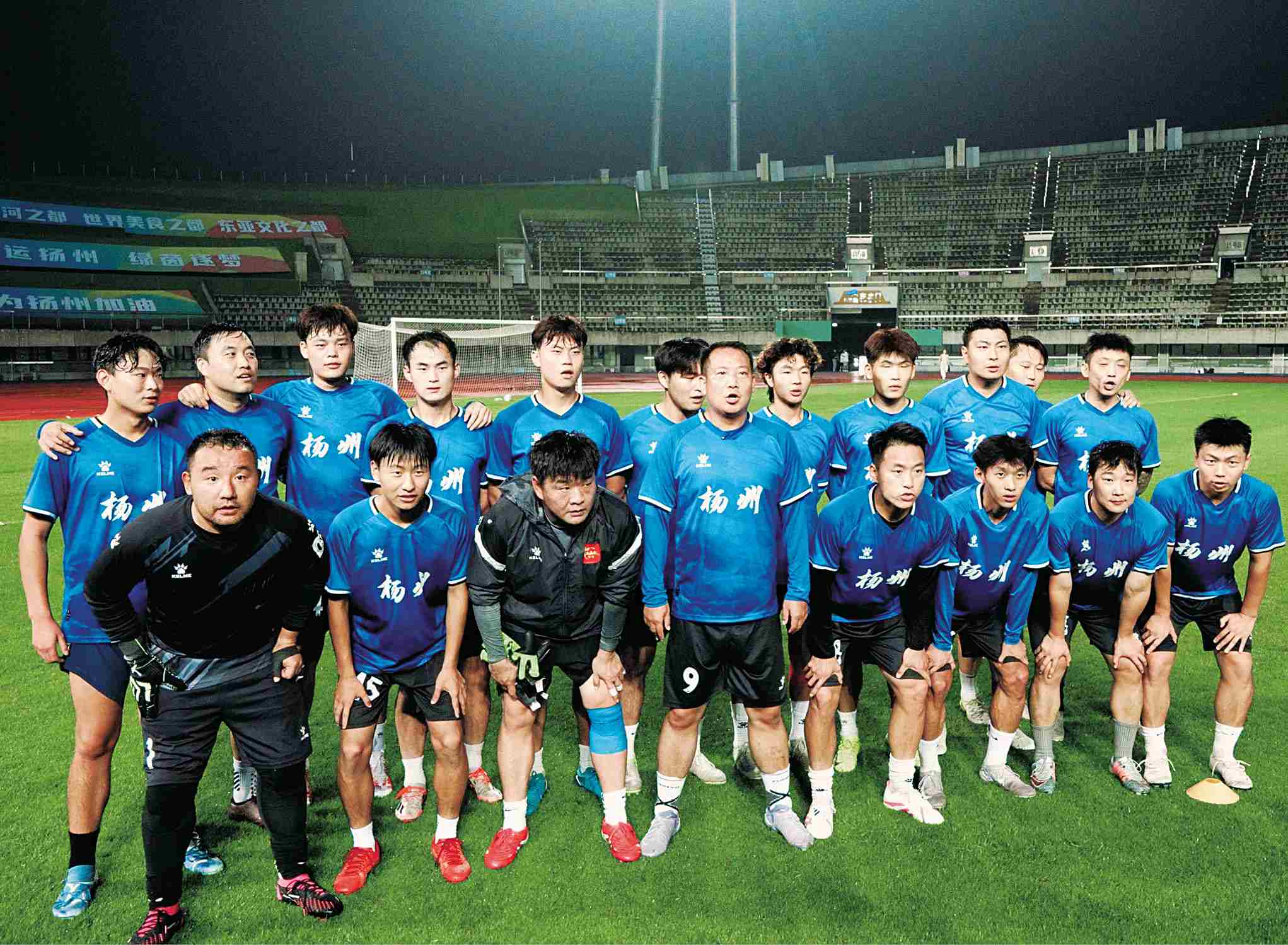 然而在3个月前,这片场地上还飘着“扬州炒饭师傅”的调侃。作为业余球员,扬州队的“大叔”们普遍身材管理欠佳,被网友戏谑“这哪像是踢球的,倒像是厨师来组队了!”邵杨天自嘲是“厨师长带队”。网友的调侃并未成为耳旁风,为了捍卫胸前“扬州”的荣誉,“大叔”们白天上班,晚上训练,其余时间都投入严格的身材管理与体能恢复中。一周六练,暂别扬州美食,早茶减半,啃胡萝卜、吃黄瓜……到第6轮比赛时大家普遍减重5到10公斤,邵杨天的体重更是从95公斤减到82公斤。