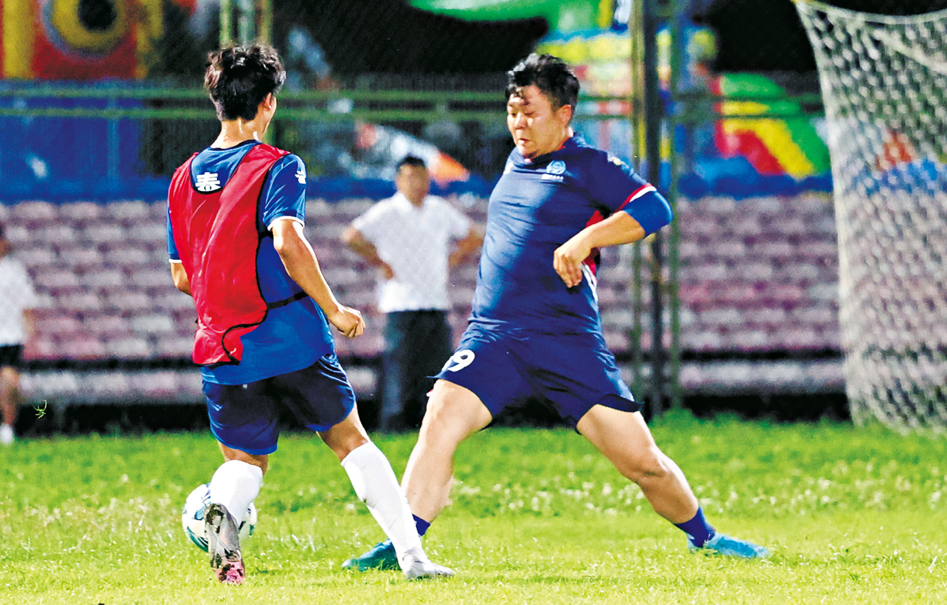 泰州队鲁张宇出场的时候,其壮硕的身材被网友调侃为“赞助商”,图为泰州队队员在泰州市体育中心田径场进行对抗训练。