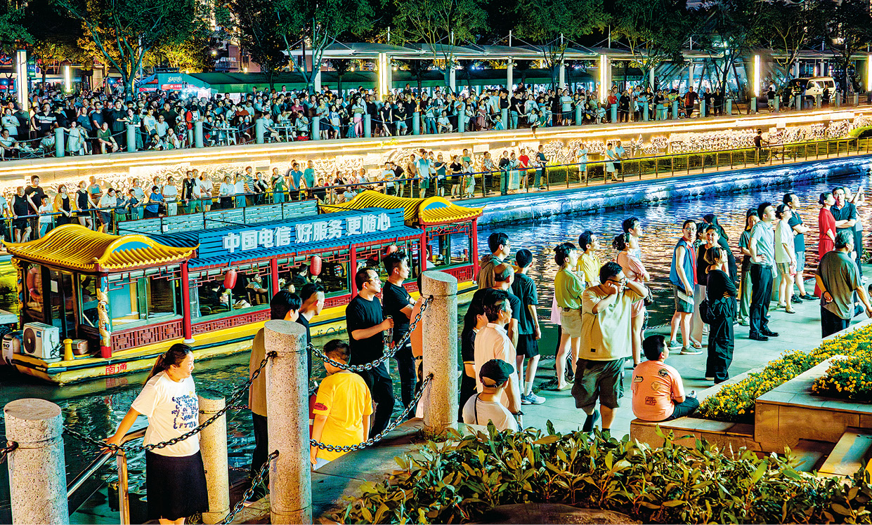 7月5日晚,南京老门东历史文化街区化身巨型露天观赛场,众多游客齐聚明城墙脚下,通过高清巨幕直播观看苏超南京队对阵苏州队的“江苏一哥”之争。