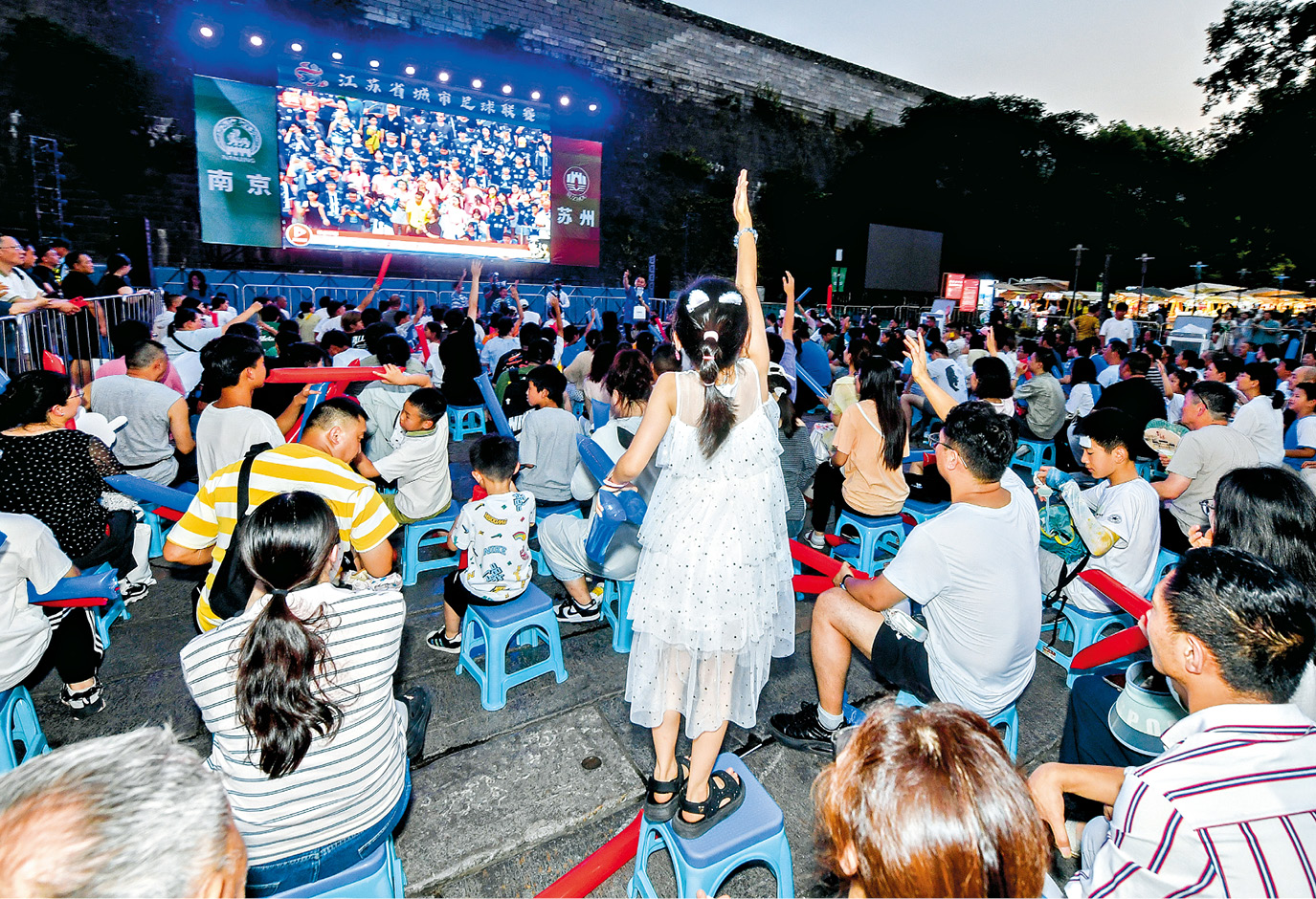 7月5日晚,南通濠河边,众人齐聚同望大屏,共赴苏超足球盛宴,激情满溢。