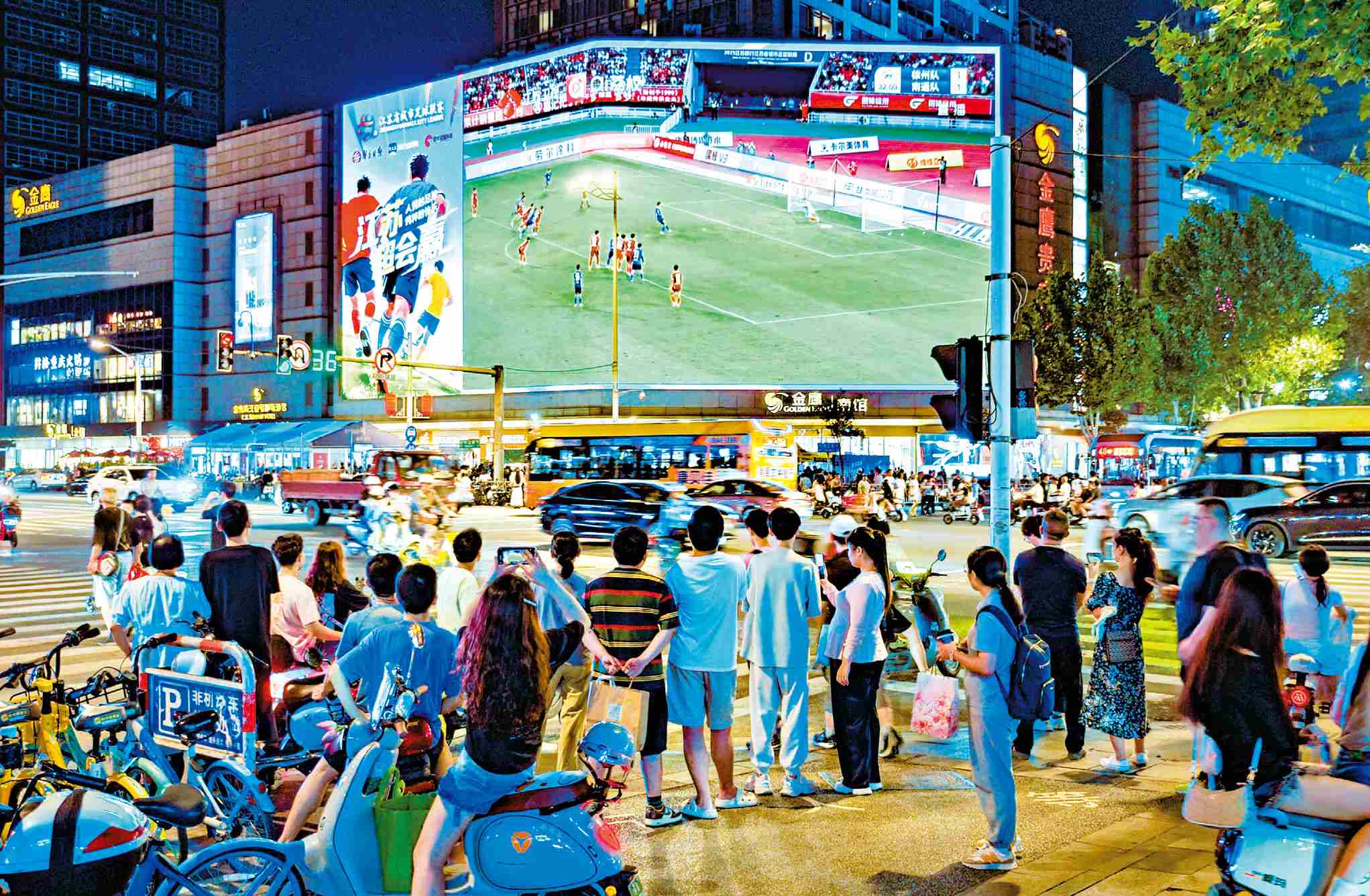 7月5日晚,南京珠江路的户外大屏正直播苏超第6轮焦点战,南京队主场迎战苏州队,很多未能到场观赛的市民聚集在此同享苏超快乐。