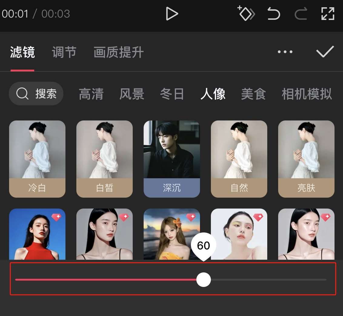 (3)选择合适的人像滤镜,点击即可应用,并可通过拖动滤镜界面下方的红色滑动条调整滤镜的强度,如图3-9所示。调整后点击对号图标即可返回视频编辑界面。