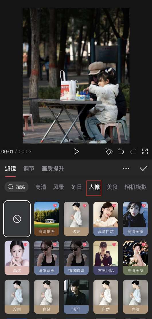 (2)在打开的滤镜选择界面中,找到并选择“人像”分类,下方即出现多种人像滤镜,如“透亮”“高清自然”等,如图3-8所示。