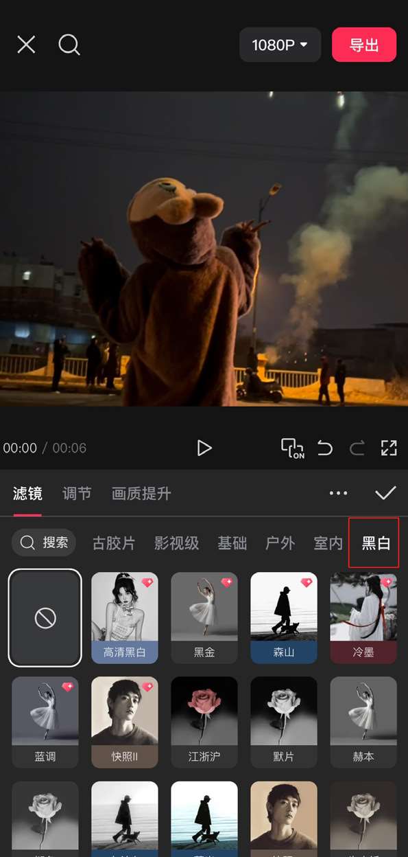 以下是使用剪映移动版给视频添加黑白滤镜的步骤。