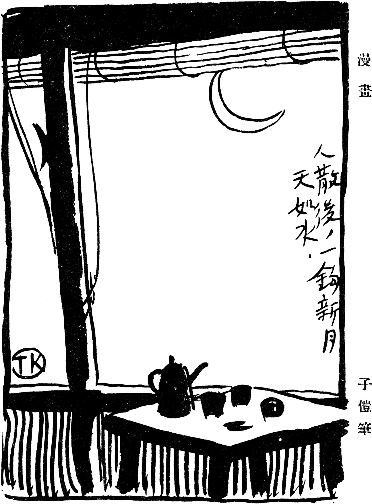 1924年,丰子恺在朱自清、俞平伯主办的刊物《我们的七月》上发表取材于宋代文学家谢逸《千秋岁·咏夏景》的《人散后,一钩新月天如水》,并明确注明“漫画 子恺笔”。这幅画得到了上海《文学周报》主编郑振铎的高度赞赏,他写道:“我的情丝被他带到一个诗的仙境,我的心上感到一种说不出的美感,这时所得的印象,较之我读那首《千秋岁》(谢无逸作,咏夏景)为尤深”。