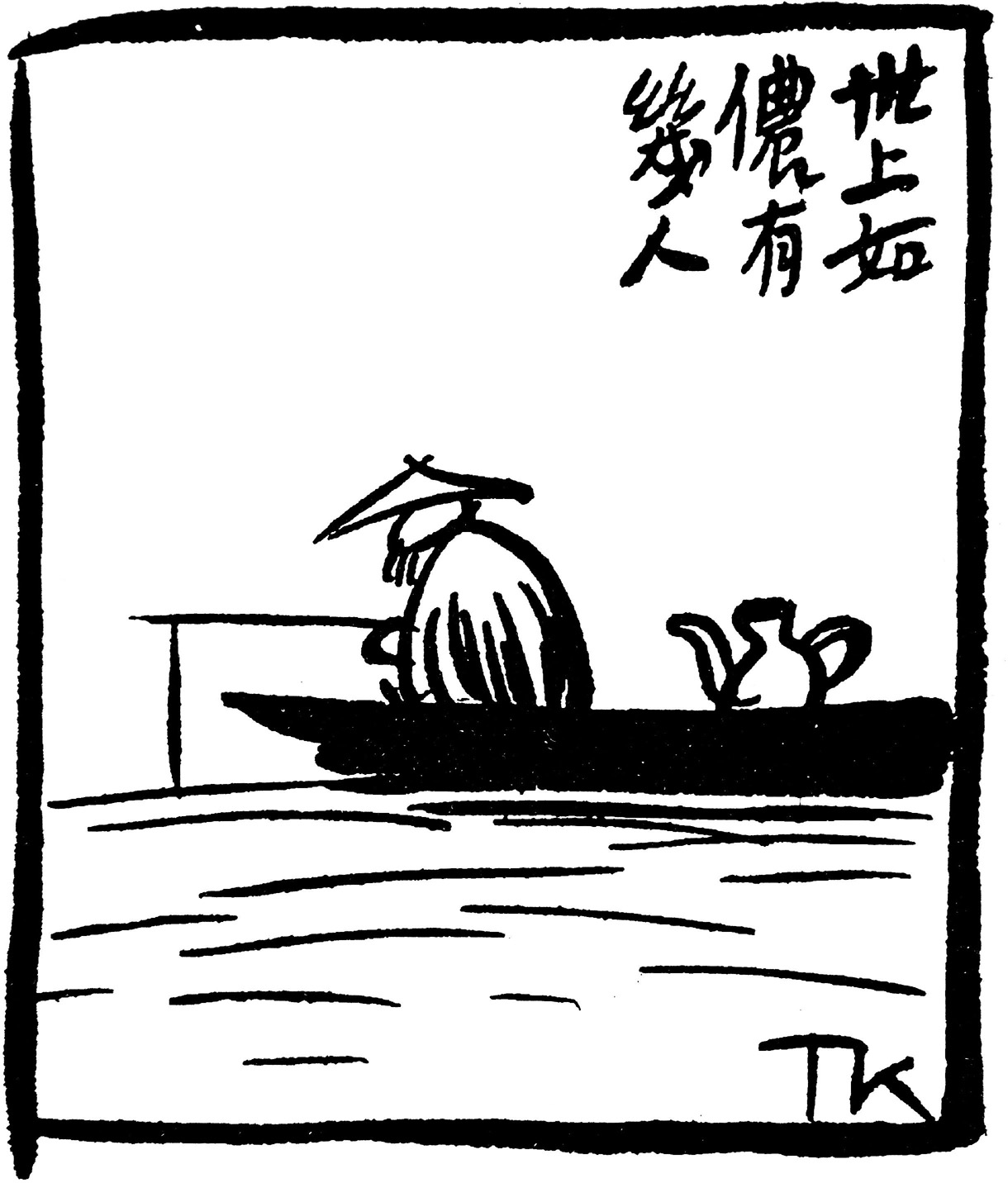 “世上如侬有几人”取自李煜《渔父》的诗句,丰子恺画中的钓翁有鱼钓有酒喝,不论多寡只求悠闲,怪不得南唐后主李煜羡慕他的逍遥自在,丰子恺也对他脱离尘世、自得其乐的生活态度倍加赞赏。