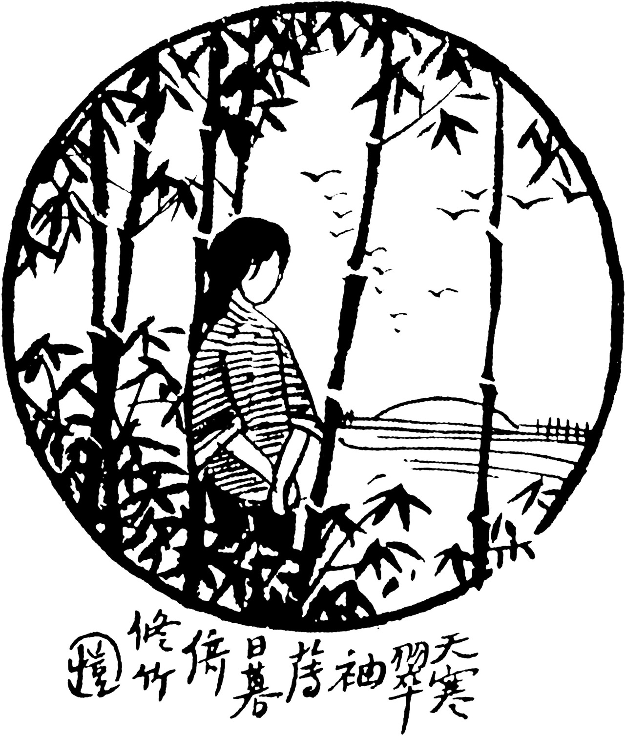 丰先生用这种圆形布局画过多幅漫画,在他的第一本画集《子恺漫画》中就有四幅。这幅《天寒翠袖薄,日暮倚修竹》发表于1926年的《文学周报》,画面简捷优美,仍然是不画脸部细节的画风,给人一种园林建筑“漏窗”般的美感。