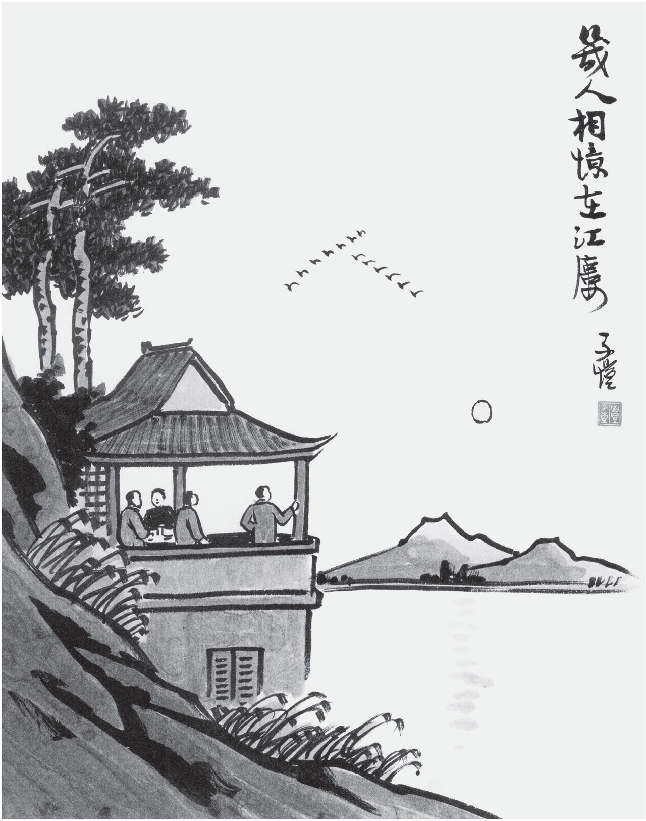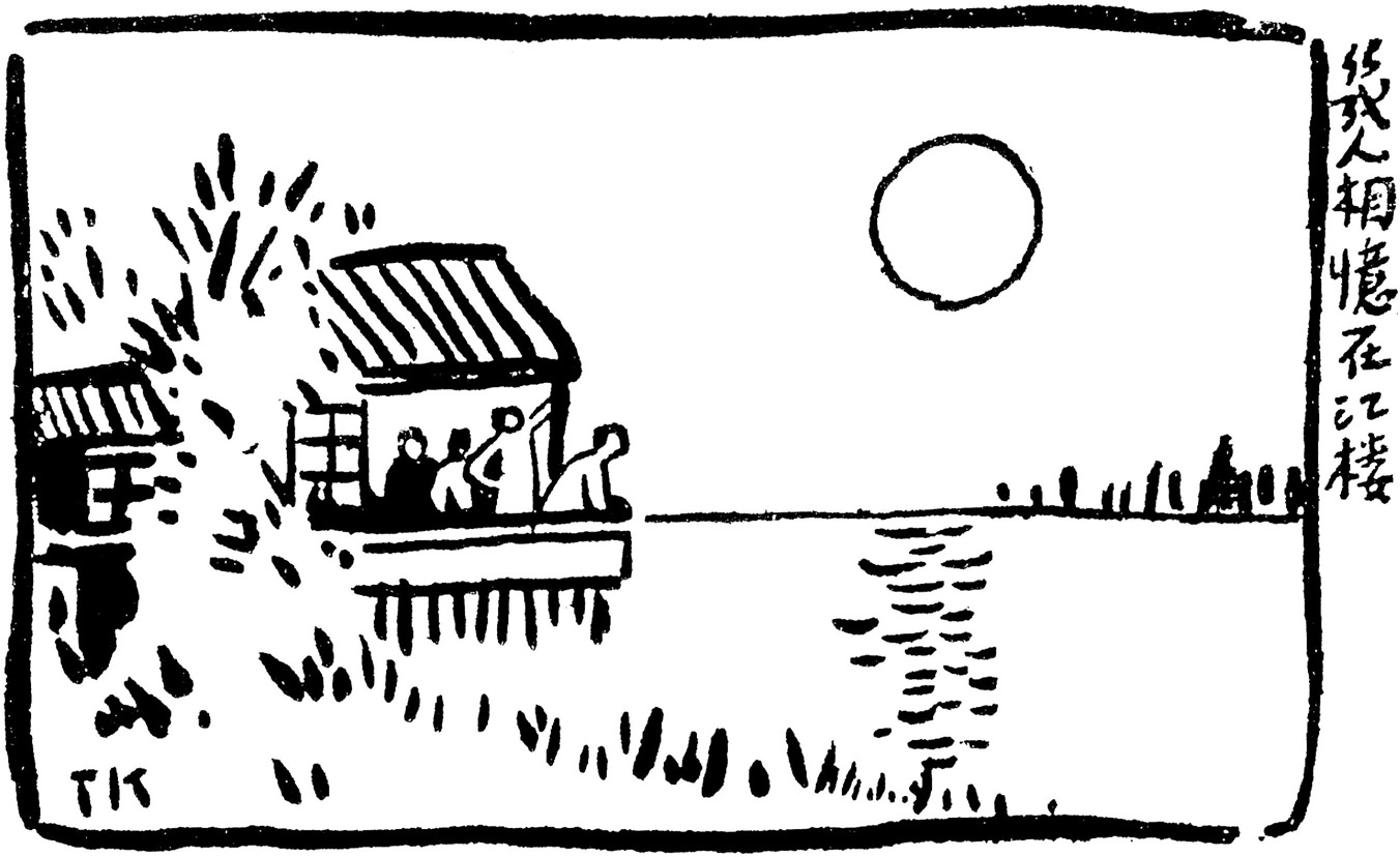 丰先生与他在上海的老师夏丏尊时有通信。夏先生在信中说:中国有人物的画分为两种,一种以人物为主,另一种以风景为主。应该还有第三种,即人物与风景并重。夏先生还谈起丰子恺以唐代杜荀鹤的《题新雁(一作罗邺诗)》创作的《几人相忆在江楼》:“无可为君慰者,唯取《几人相忆在江楼》横幅张之寓壁,日夕观览,聊寄遐想,默祷平安而已。”丰先生回忆:“‘几人相忆在江楼’这一句诗,实在就是夏先生所盼望的第三种画的最好的画题。故虽为遥念我而挂这画,同时也可说是为了这适合他的艺术趣味而挂这画。诗句中的要件‘几人’与‘江楼’,正是人物与风景并重。夏先生所盼望的,便是这画的‘中国画化’。”