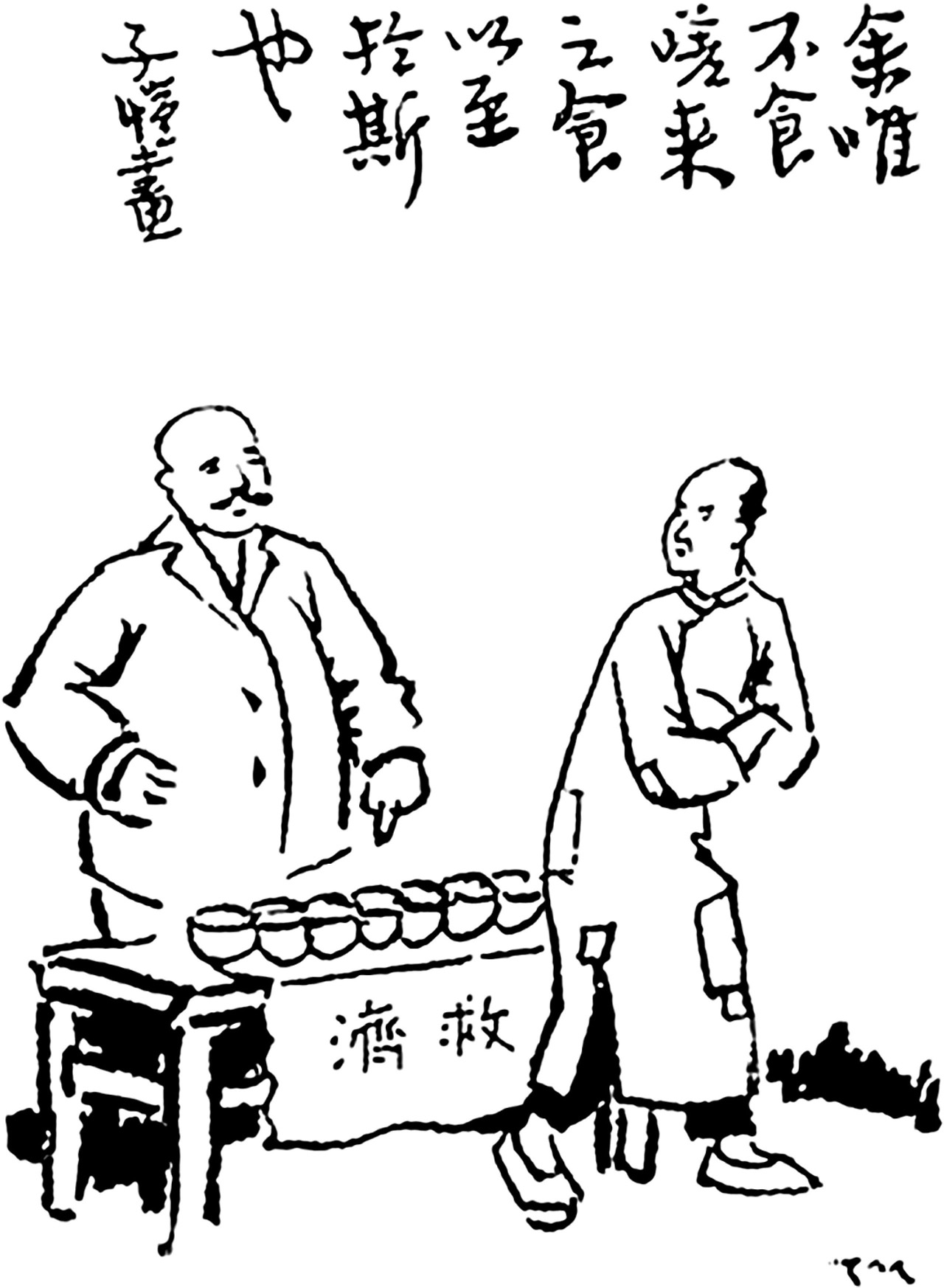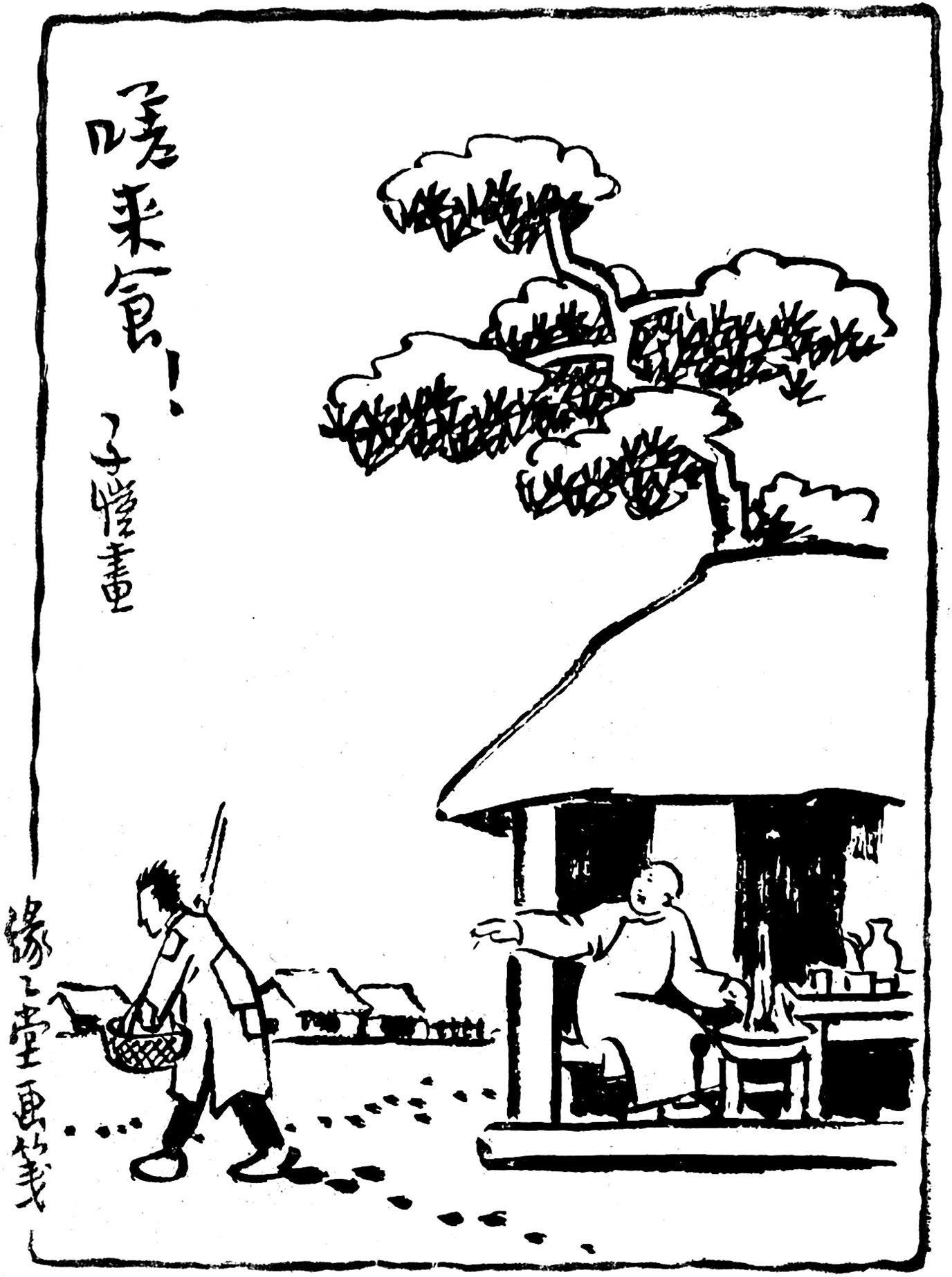 丰子恺先生以这个题材画过多幅漫画。1937年以《嗟来食》为题为《宇宙风》杂志画封面画,1947年又以《余唯不食嗟来之食,以至于斯也》为题画过漫画。在随笔《未来的国民——新枚》中丰先生说:他逃难经过兰溪,偶遇做战地记者的老同学曹聚仁,他请丰子恺吃饭。饭桌上曹聚仁说起杭州某人率眷坐车等待过江,一小孩误操作车子开入江中,全家灭顶。最后曹聚仁又说:“这故事其实是很好的。”言下之意是“像你这样的人,拖了这一群老小逃难,不如全家死了干净”。丰先生说:“我吃了这顿‘嗟来之食’,恨不得立刻吐出来还了他才好。”