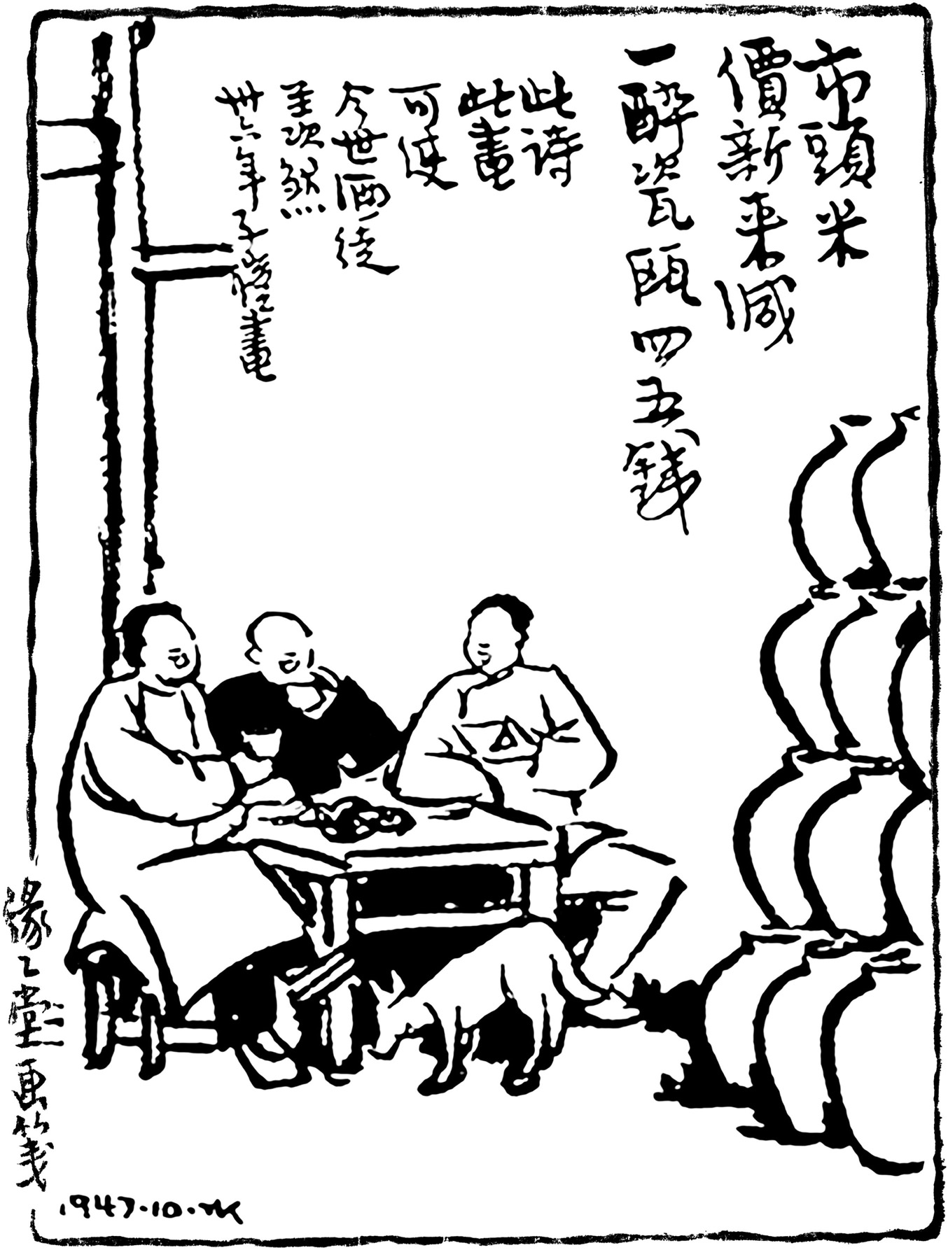 刘子翚字彦冲,崇安人,是位道学家、理学家,宋代最大的道学家朱熹就是他的门生。诗名中的“莫”字,古时既通“漠”,指广漠的农田,又同“暮”,为傍晚时分。这首《莫田》描绘的是农民在田间打麦的景象,农村中孩子们在打麦的蓬蓬声响中捡拾遗落的稻穗,一派欢快的景象。值得注意的是,诗的后半段写酒贱,能喝醉人的一瓷瓯酒只要五六钱。那么,为什么在丰先生的漫画中“一醉瓷瓯”更便宜些,成了“四五钱”?丰先生在这幅漫画中说:“此诗此画可使今世酒徒羡煞。”这里所说的“今世”,正是画这幅画的1947年10月,那时我国正经历货币严重超发引起的通货膨胀——发工资用麻袋装,买来的粮食却吃不饱。“五六钱”变成了“四五钱”则是丰先生用夸张的漫画创作手法,把刘子翚的诗句略微改动了一下。