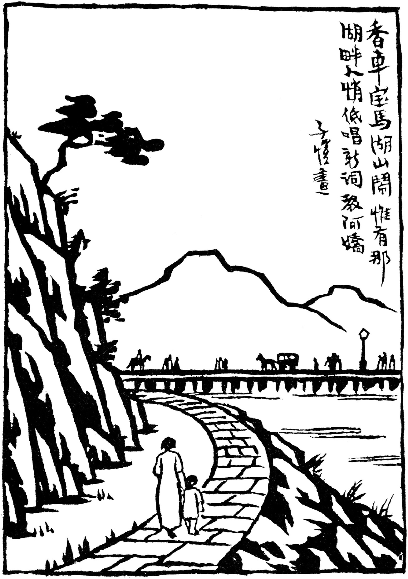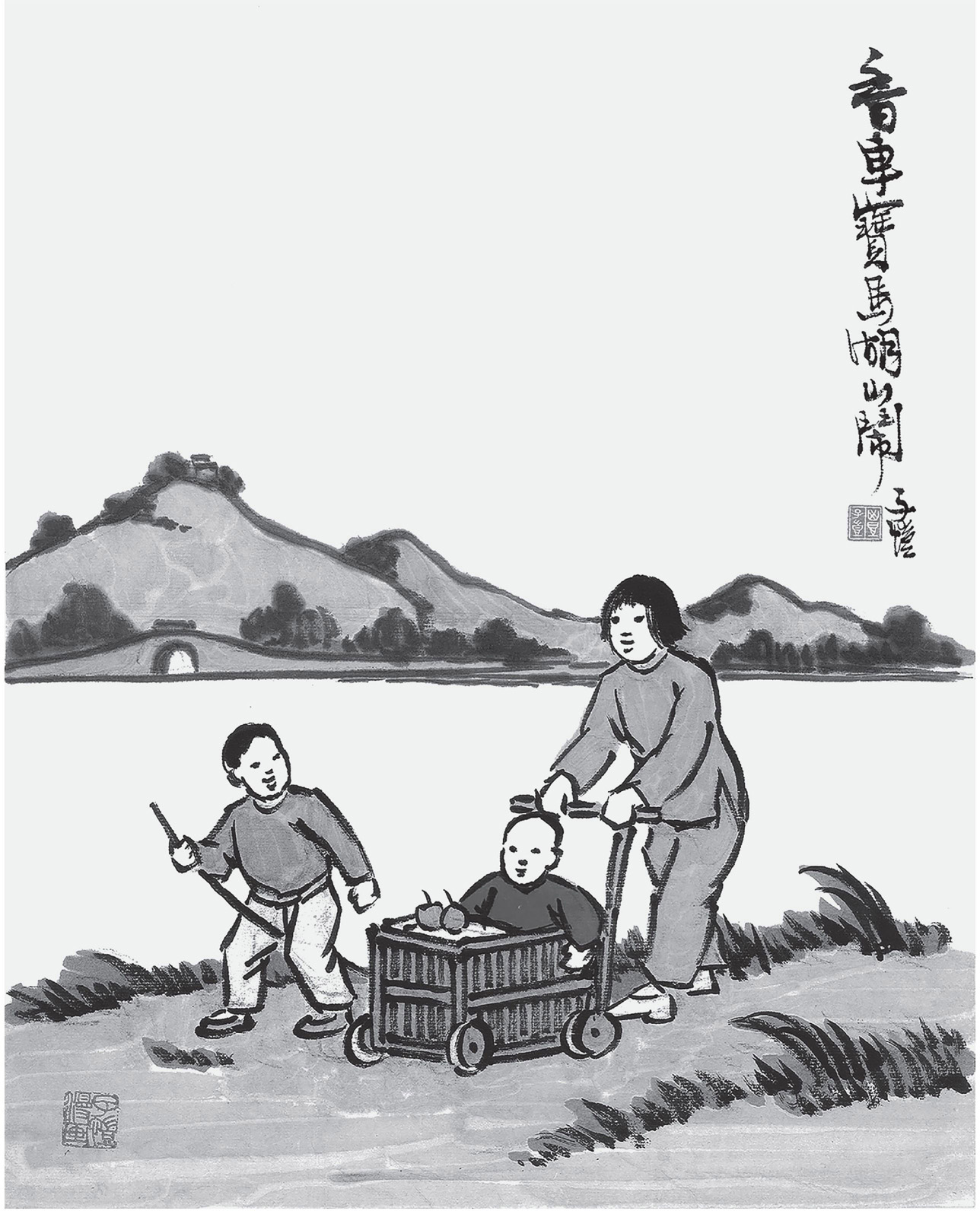 赵庆禧字继扬,是道光进士,曾任陕西延川知县。他能诗文,擅长散曲,作品有《蘅香馆诗稿》《香消酒醒曲》等。丰先生用原诗作题绘画,意犹未尽,又予以“篡改”,把后两句改为“唯有那湖畔人俏,低唱新词教阿娇”;仍然意犹未尽,又以童车替代“香车”,以竹马替代“宝马”来作画;还以“小语春风弄剪刀”为题再画彩色画。丰先生用这首短短的《春晓》,演绎出多幅绘画作品。