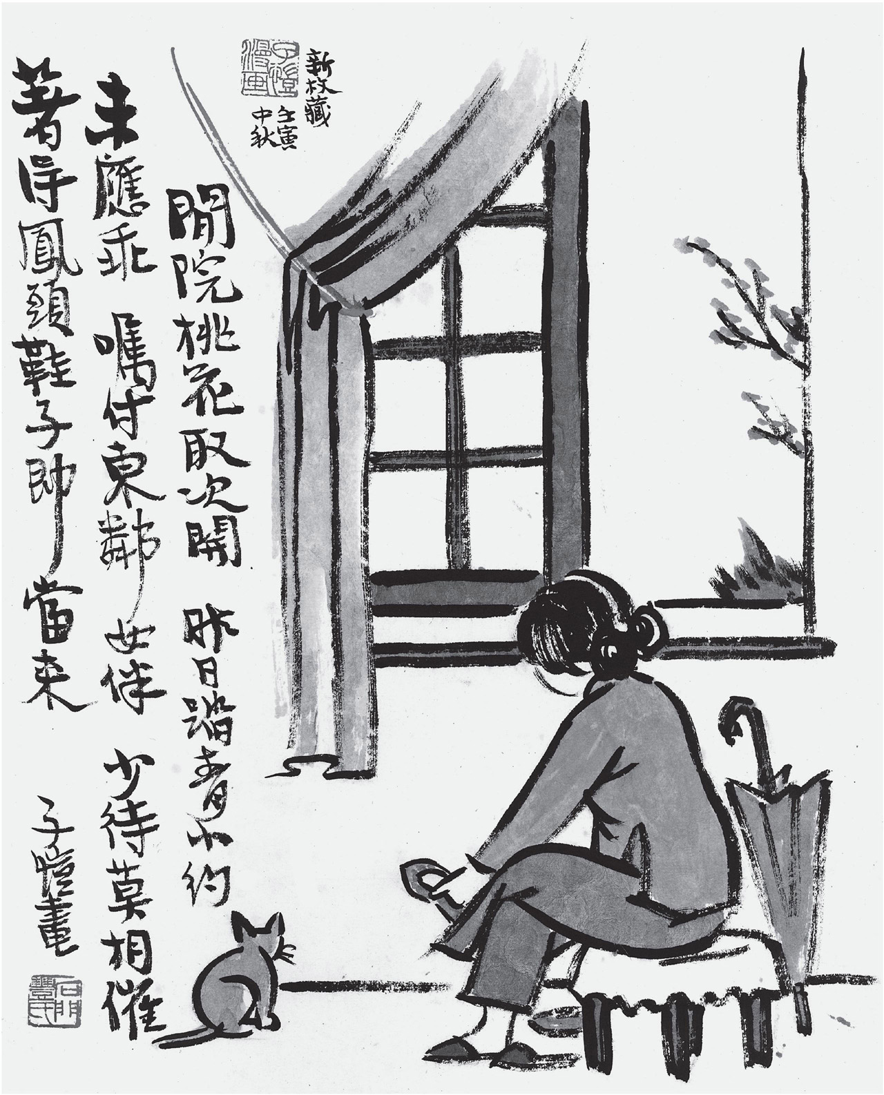 而丰子恺先生的绘画描绘出了“着得凤头鞋子即当来”的画面。也许是由于画面安排所需,丰先生在题字中改动了一个字,把蒲松龄的“闲阶”改为“闲院”——院子里有一枝桃花探出在窗前。