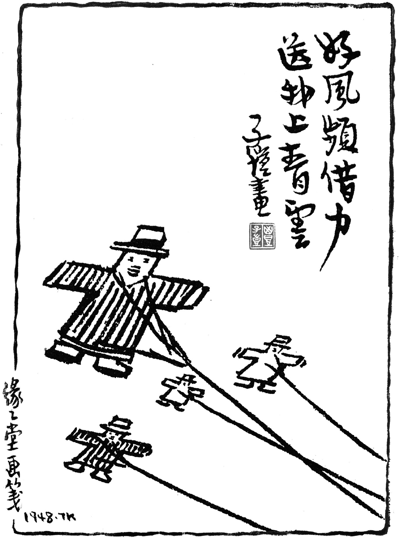 薛宝钗的这首词之所以能做到“不落俗套,匠心独运”,其根本原因,正在于道出了其他人都没有想到要写的内容,而丰子恺的《好风频借力,送我上青云》,又把柳絮改为凭借东风扶摇直上的风筝。更重要的是,丰先生把这些风筝画成一个个人的形状,使这幅画与诗词隐喻的内容更加贴切,真正做到了诗与画的交融互补,增加了诗词与绘画的艺术趣味。