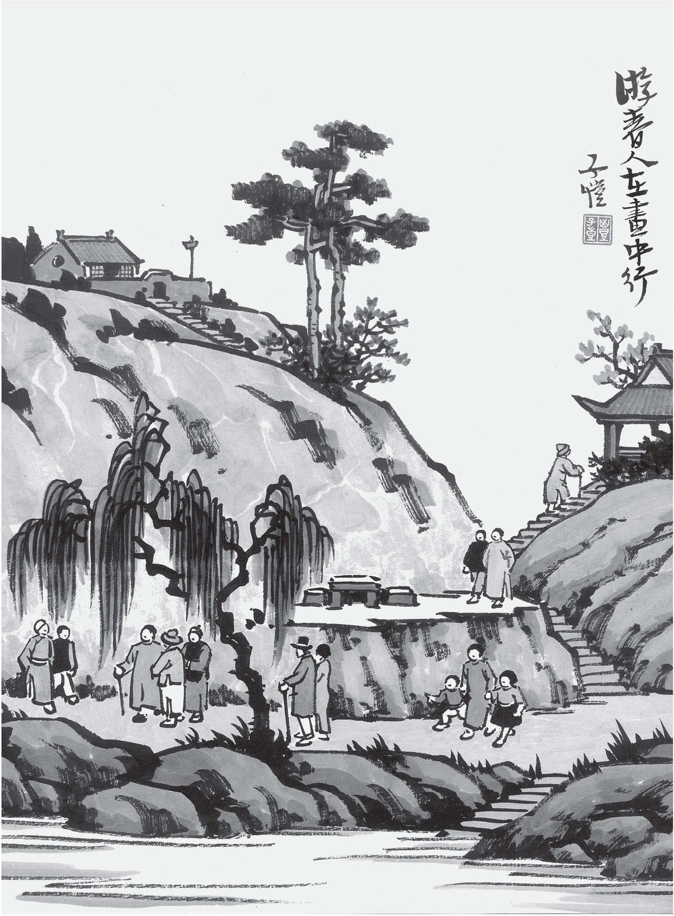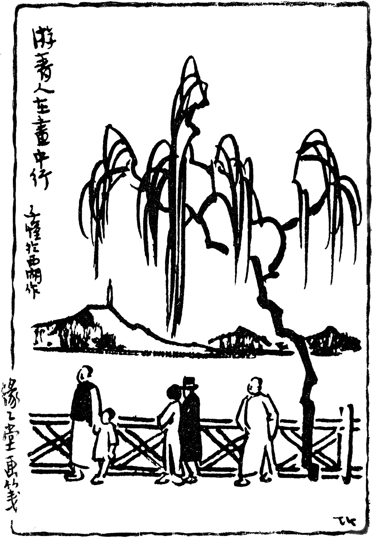 也许是特别喜欢李叔同先生的歌《春游曲》,丰子恺先生用这句“游春人在画中行”画过多幅漫画。李叔同《春游曲》的歌词如下: