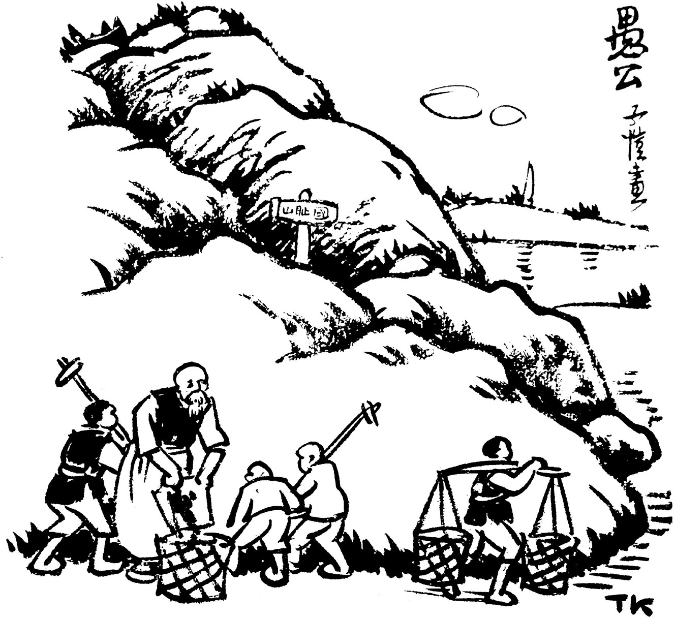 丰子恺所作漫画《愚公》,发表于1936年1月的《经理月刊》,同时发表的还有《“大中华”》《民间之春》等三幅宣传民主、和平的漫画。《愚公》这幅画画的是一老翁率领子孙四人,他们挖的挖挑的挑,正在努力挖除一座大山,这座山上插着一块牌子,上面写着“国耻山”三字。丰先生以一座大山来象征中华民族的国耻——发生于1931年9月18日震惊中外的“九一八”事变。