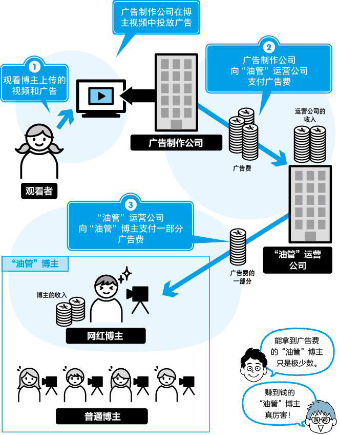 正如金融规划师夫妇向小浩说明的,“油管”博主收入的主要来源是“广告收入”。点击博主们制作的视频,经常会出现广告。这些广告里面,企业支付的广告费的一部分成为博主的收入。