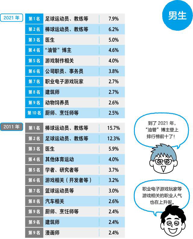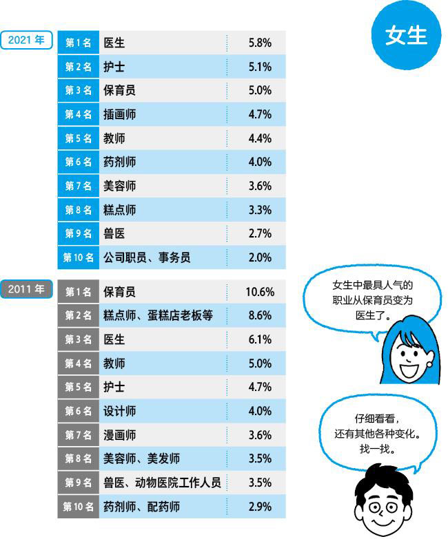 孩子心中理想的职业随着时代的变化而改变。博主这个职业如此受欢迎是近几年才开始的事。在下面展示的小学生“理想职业”排行榜中,可以看到2011—2021年这10年间的变化。我们可以和孩子们共同探讨“为什么高人气职业发生了变化”“未来10年高人气的职业是什么”等问题。也许孩子想从事的职业,是我们目前还未知的职业。