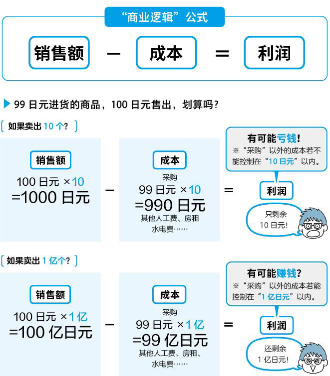 小浩: 原来是这样。那比如说,卖1个的利润是1日元,如果卖出1亿个就能赚到1亿日元,这也是不错的,对吗?