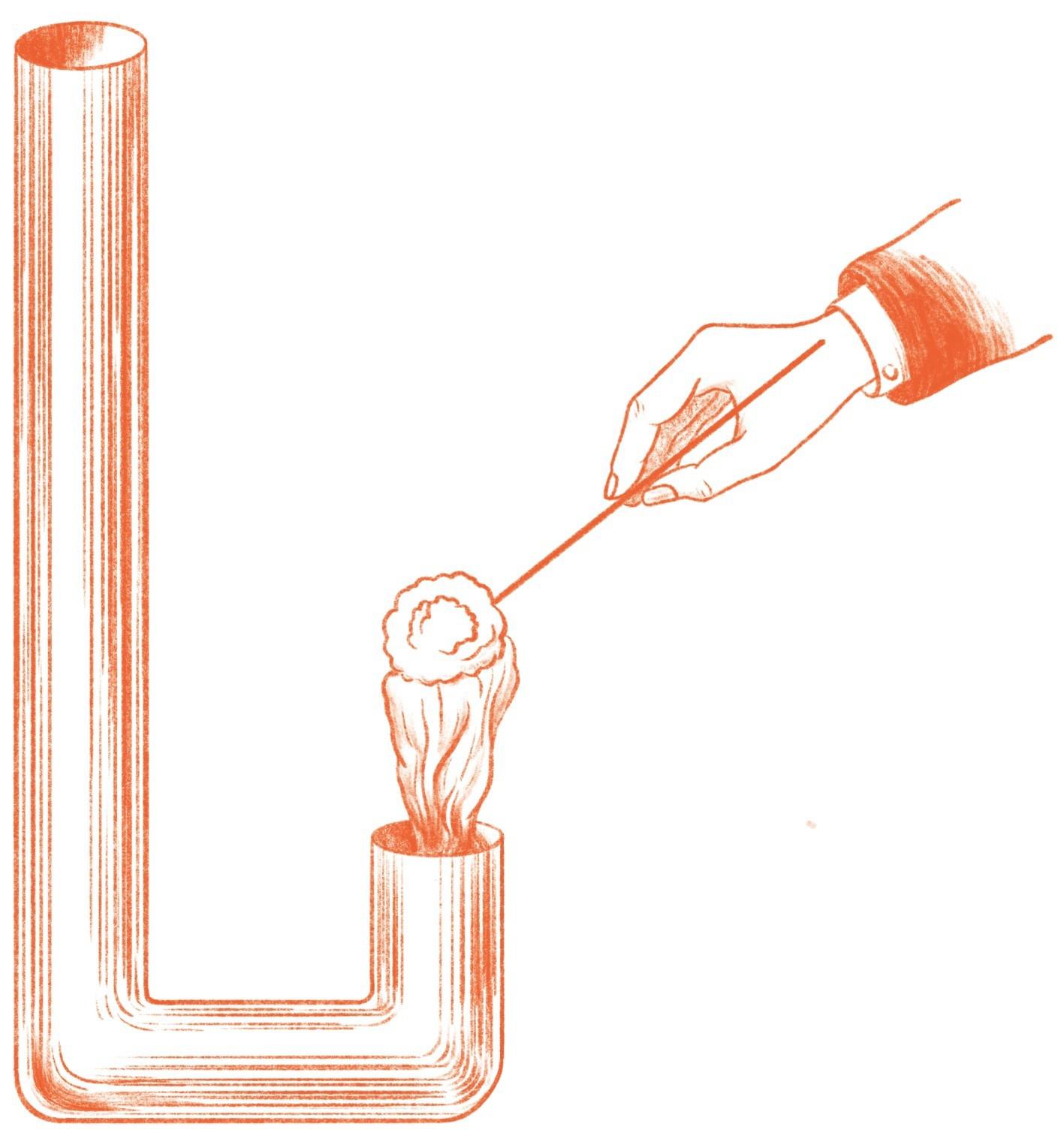 还有一个毛细现象的例子。这儿有一根芦苇,有时我在街上会看到一些小男孩模仿大人的样子,点燃一根芦苇,假装自己在抽雪茄(这对身体很不好,你们可千万别学)。他们能把烟吸到嘴里,正是因为芦苇中间能够透气,产生毛细作用。如果我将这根芦苇放进一个装莰烯(kǎn xī,可以用于合成樟脑,总体性质与石蜡相似)的盘子中,莰烯就会像刚才的蓝色盐水一样爬上芦苇的顶端。因为芦苇外部没有孔洞,所以莰烯只能从中间穿过到达另一端。当莰烯到达芦苇的另一端后,点燃它,这样就做成一根芦苇蜡烛了。液体在芦苇中上升和在蜡烛的棉芯中上升都是毛细作用的结果。
