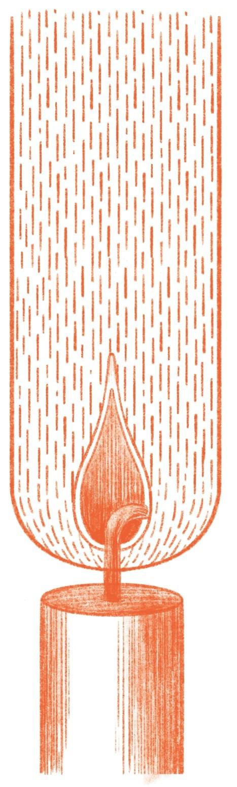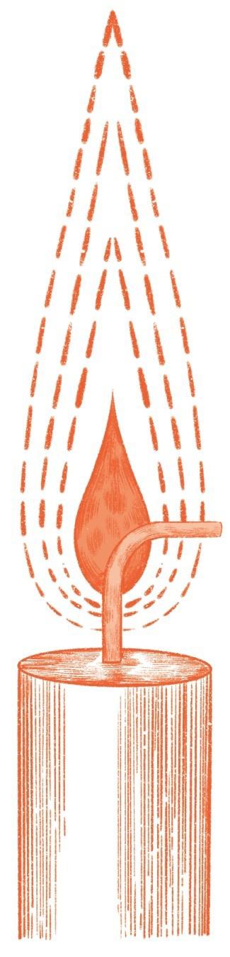 那么,火焰又是如何源源不断地获取燃料的呢?其实是因为一个神奇的现象,叫作毛细引力(毛细作用决定液体在毛细管中上升或下降,毛细管既可以吸引液体,也可以排斥液体。如果将一根两端开口的玻璃管插入水中,水会立即在管中上升,远高于外部水平。如果插入汞中,则会表现出排斥而不是吸引,汞在管中的液面会低于管外的液面)。“毛细引力!”你们也许会说,“细细的毛还能有引力?”过去人们发现细小的毛发能吸取液体,就起了这么个名字,然而他们并没有弄清楚真正的原理,其实并不是毛发能吸取液体,而是液体对毛发有吸引作用。不要太在意这个名字,也先不深究这个引力,我想说的是,正是由于毛细引力,蜡液才能够一步步爬上烛芯顶端,储存在烛芯中,并且持续地进入火焰中心,维持燃烧反应。