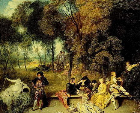 他们在安托万·华托的画中学到了明亮色彩的细腻表达技巧,学会了用极为巧妙的调色描绘自然闪烁着微光的效果。