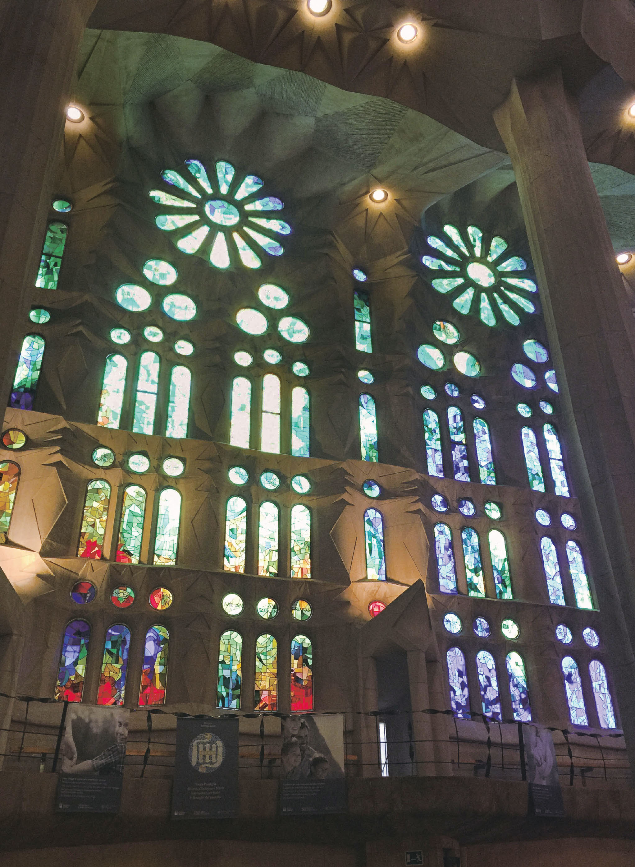 整座教堂的所有门柱上都有精致的雕刻和繁复的细节,让人叹为观止。教堂内部更是诠释了光线和建筑史诗级的对话,没有一盏彩色的灯,却处处都有温暖明媚的光。走进教堂就像走进奇幻森林,教堂立柱犹如树干,向上生长出若干树枝,支撑起巨大的拱顶。阳光透过两侧彩色的玻璃窗,一面是蓝色、青色、紫色组成的冷色调,一面是由橘色、火红、黄色组成的暖色调。