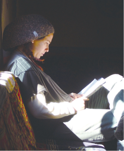 酥油茶馆的角落里专注阅读的游客