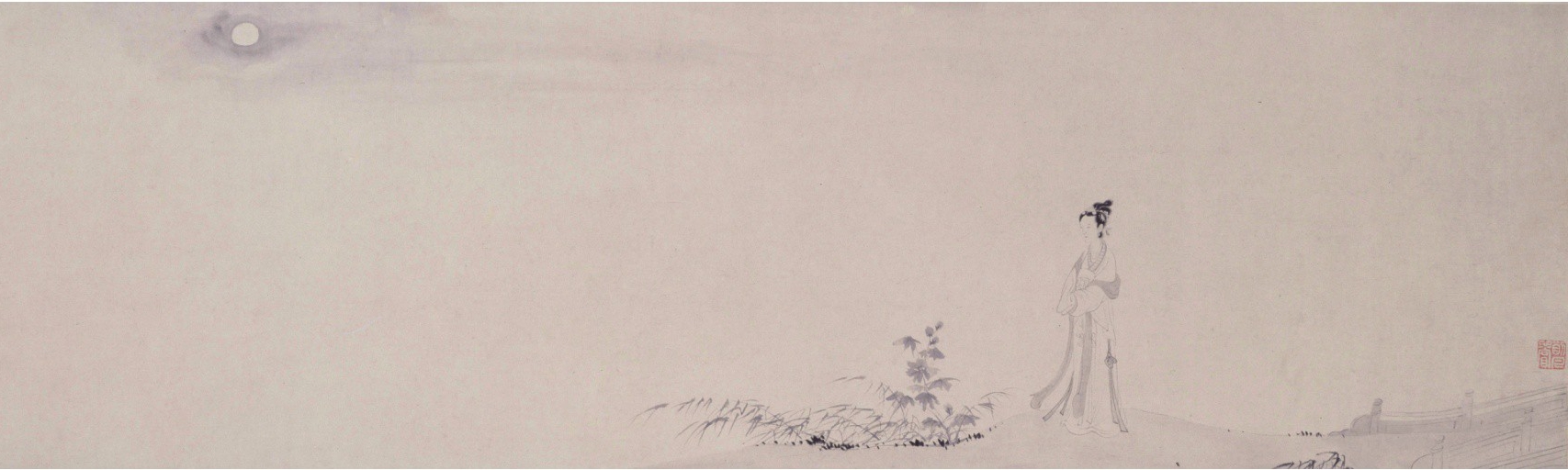 就像下面这幅《招仙图》。画中只有一个女子,一个小土坡,几丛植物,以及天上的一轮圆月。这幅画的画面上别无提示,人们只能看到一个女子正举头望月,可莫名地,人们总会觉得画中的女子正在思念着远方的某个人。