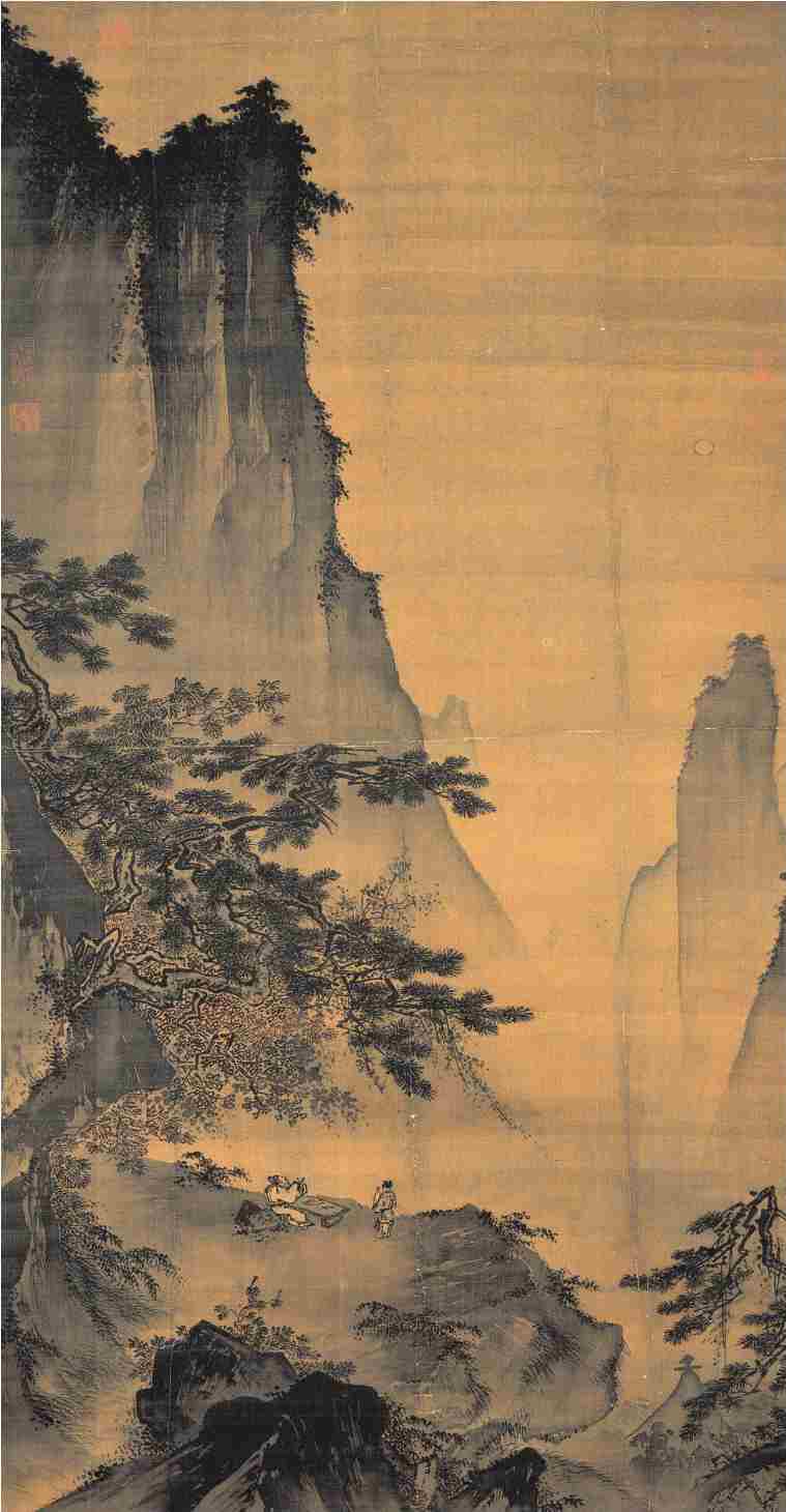 正是因为那小小一轮不起眼的月亮的存在,这幅画就不是一幅纯记录自然的“空镜头”,画中人的动作、姿态与他周边的高山、松柏都被重新组织了起来,成了一种隐喻,画面也有了山水景致之外的情感与深意,能带给观众更多的联想空间。