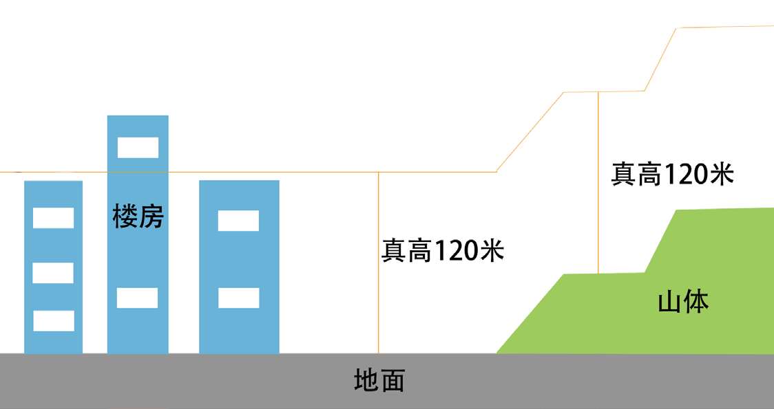 (1)真高:指无人驾驶航空器飞行时,其机体底部到地表面(含山体地面)的垂直距离。例如:在海拔3000米的高原起飞,无人机起飞至100米,则真高为100米;在城市起飞,真高以地面(非楼顶)为基准,如楼高100米,无人机在楼顶起飞至上方20米,则此时真高为120米(图2-2)。实际飞行中,应注意避免混淆建筑物高度与海拔。