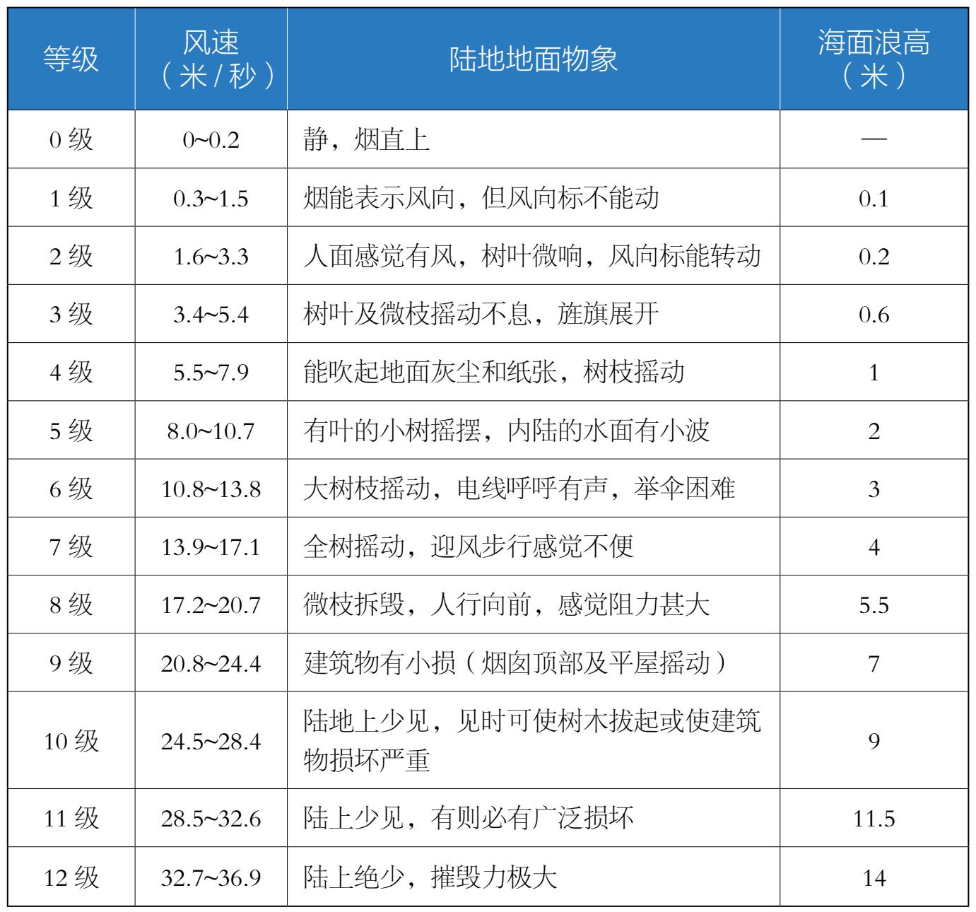 表1-4 中国气象局《风力等级》国家标准(GB/T 28591-2012)风力等级参考表
