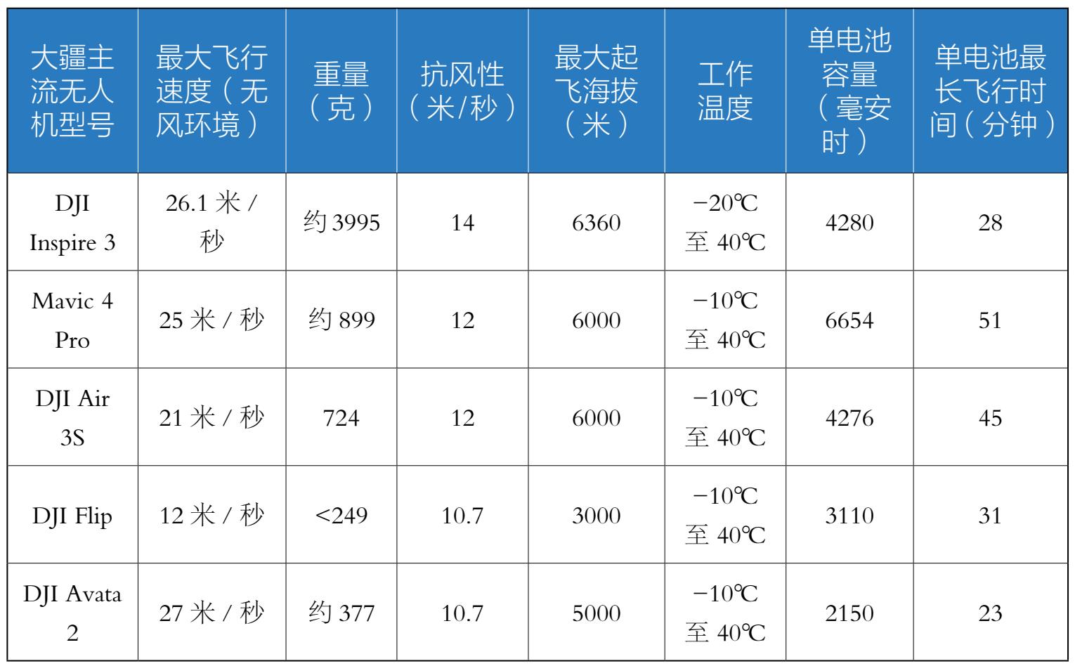 大疆主流无人机的飞行能力对比如表1-3所示。