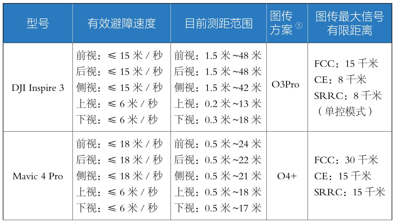 表1-5所示是一些大疆主流无人机的详细避障及图传数据。