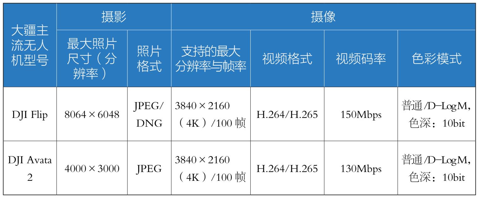 大疆主流无人机的摄影与摄像能力对比如表1-2所示。