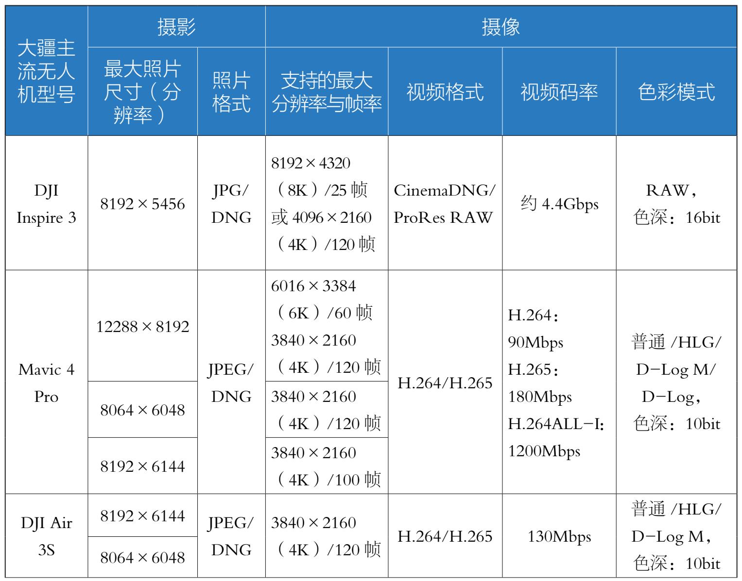 表1-2 大疆主流无人机摄影与摄像能力对比