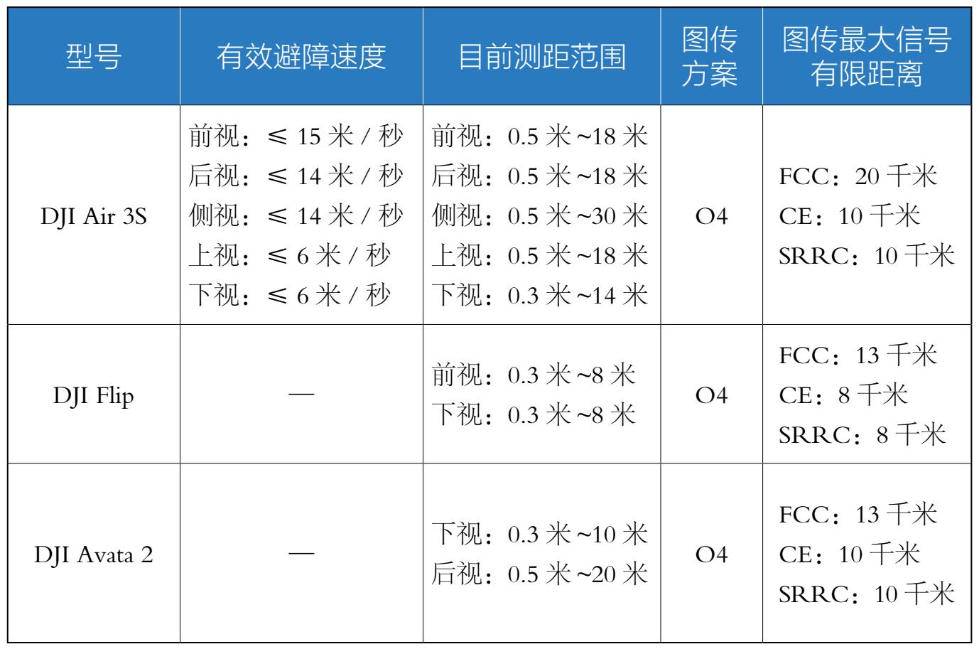 表1-5 大疆主流无人机避障与图传对比