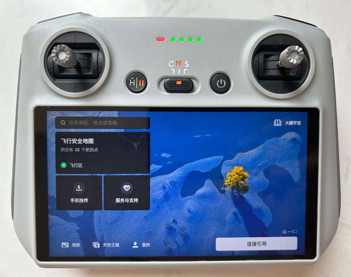 大疆无人机遥控器配备了双摇杆、折叠天线(或内置天线)、快捷键(一键返航键/摄影摄像键/自定义按钮C1/C2)、飞行档位切换及云台控制拨轮(图1-5)。常见的遥控器续航3~5小时,支持边充边用,可满足长时间飞行任务。随着产品迭代,遥控器从最初的普通遥控向带屏遥控进化,同时在图传信号、屏幕亮度、内置系统上也逐步提升。以最新DJI RC PRO2遥控器为例,支持最新O4图传,7英寸高亮 Mini-LED屏幕观感惊艳,还可在旋转时同步让无人机云台秒切竖拍。此外,支持HDMI信号输出,自带麦克风收音功能,这为记录飞行环境声音与进行航拍直播提供了硬件支持。