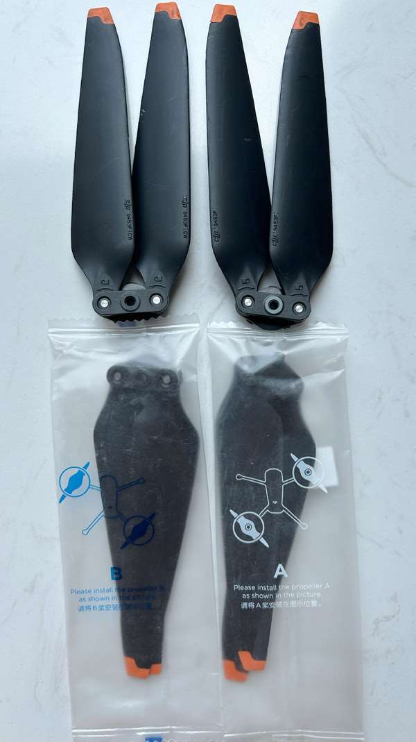 如图1-7所示为无人机桨叶。大疆无人机桨叶普遍采用碳纤维与高强度塑料复合材料,通过高速旋转克服重力,实现起飞和悬停。调整四个电机的转速,能让无人机完成前进、后退、转向、倾斜等动作。无人机桨叶分为A、B两对,拥有折叠与快拆结构,无需工具即可快速更换。由于有自紧桨机制(旋转离心力可使桨叶卡槽锁紧电机防止脱落),安装时需注意正反桨叶方向(桨叶上有标注)。使用折叠无人机起飞前,请确认桨叶完全展开并锁紧,此举可减少机身起飞时的晃动。由于高速旋转的桨叶动能极大,所以请确保起降区域周边环境安全。桨叶的正常使用时间约200小时,撞击后建议及时更换,确保飞行安全。