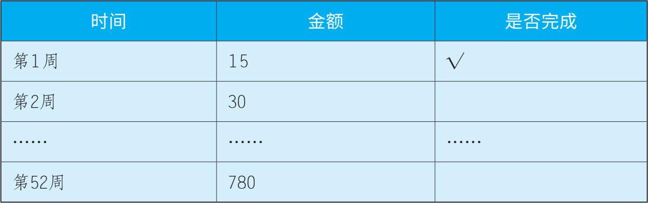 如果我们第1周存15元,后续每周再递增15元,全年就可以成功存下(15+52×15)×52÷2=20670(元)。怎么样?是不是简单到让你觉得“这也算存钱法?”