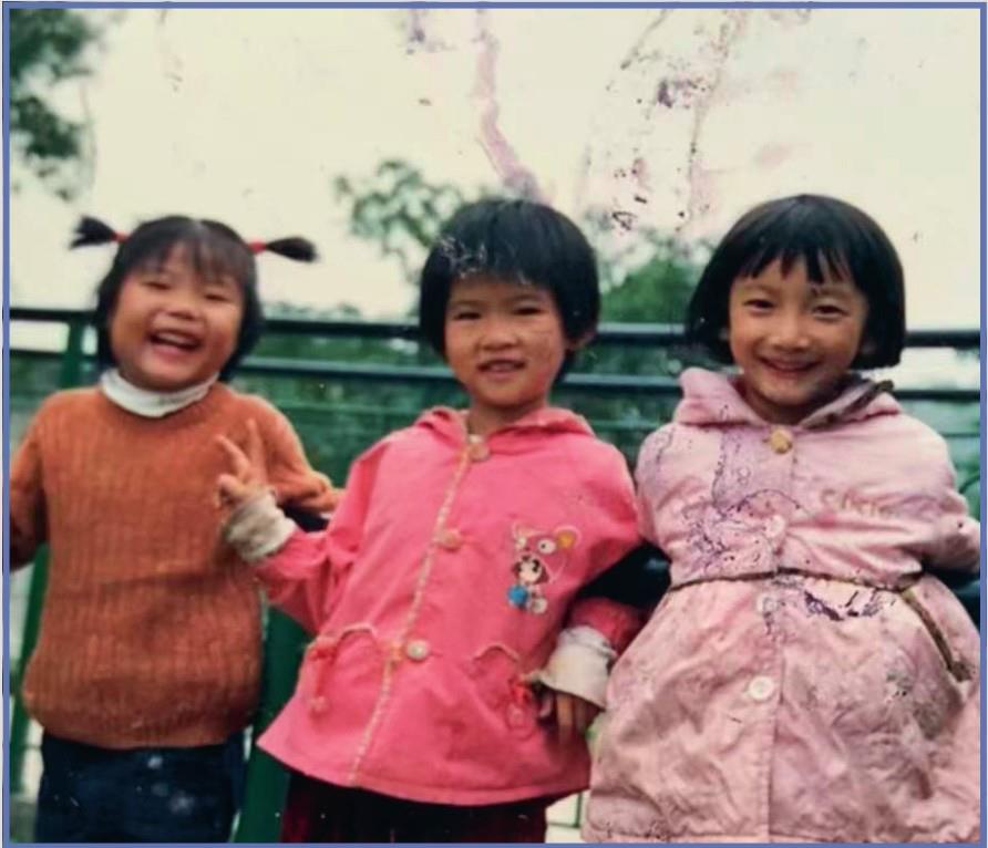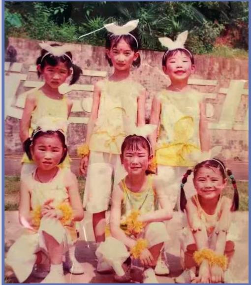小学时我(后排中间)参加才艺表演,那时流行在眉心点上一抹红色